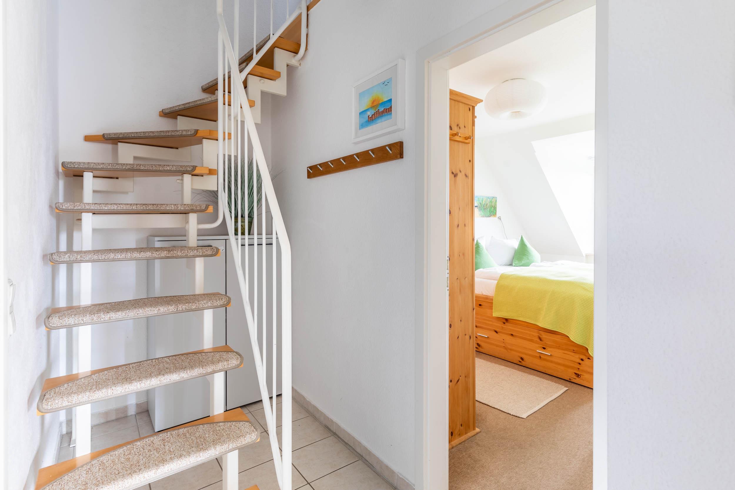 Schlafzimmer (unten): Doppelbett und großer Kleiderschrank