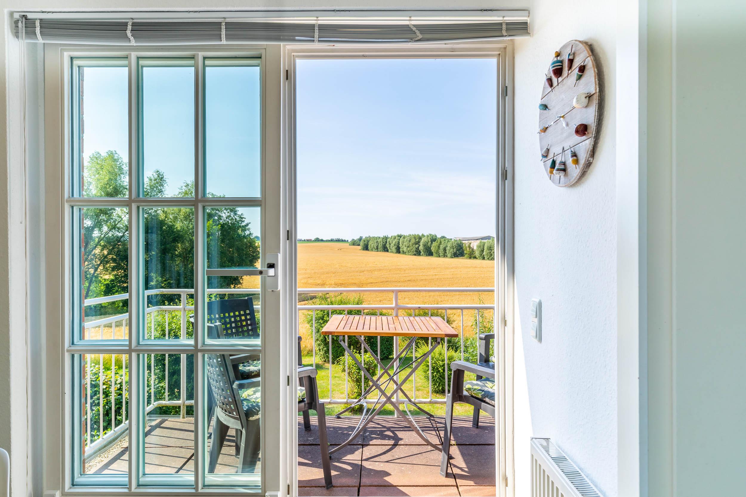 Der helle Wohnbereich lädt mit einer gemütlichen Schlafcouch (für 2 Personen) und einem Flatscreen-TV zu entspannten Abenden ein. Streaming über Waipu sorgt für zusätzliche Unterhaltung. Von hier aus gelangen Sie direkt auf den möblierten Balkon – perfekt für ein Frühstück im Freien oder einen ruhigen Tagesausklang mit Blick in die Natur.
