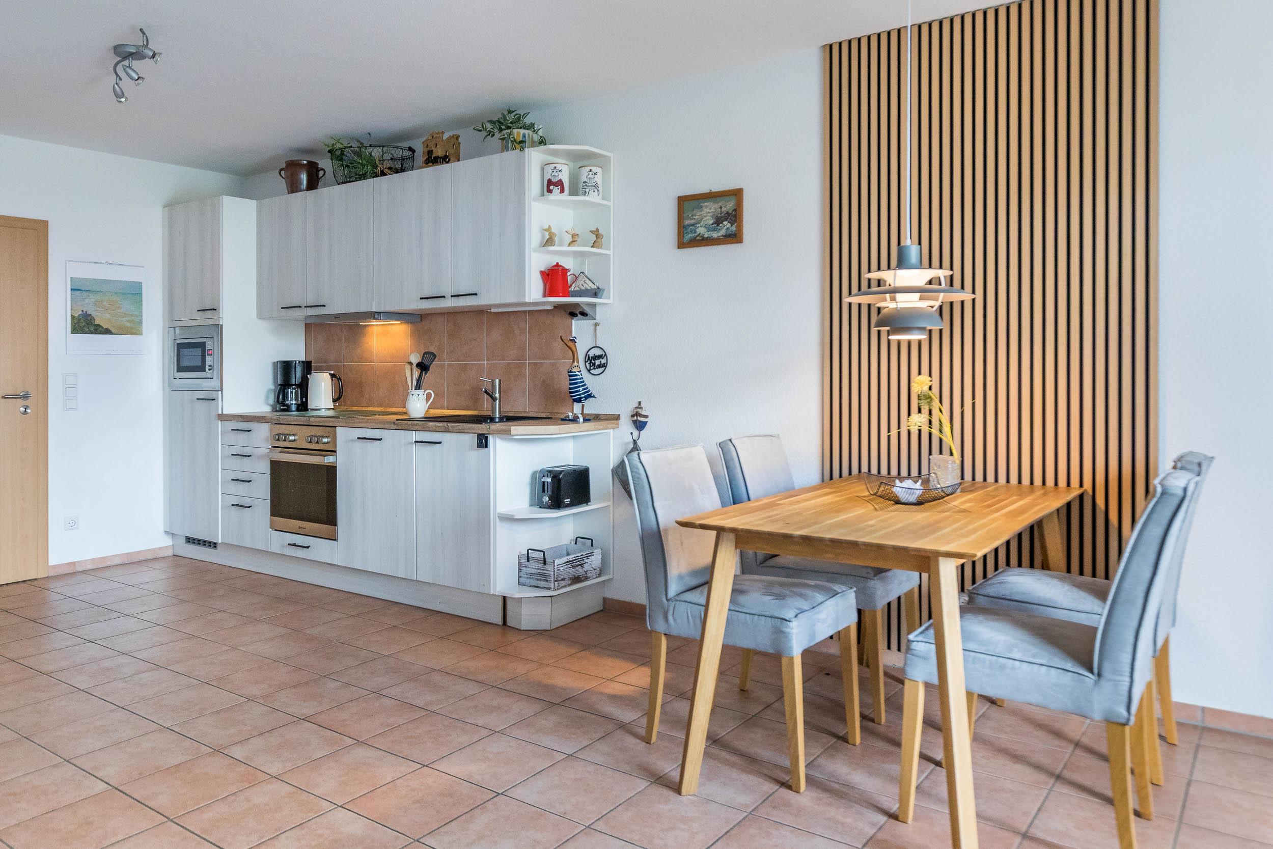 Die offene Küche ist mit Spülmaschine, Herd, Mikrowelle und vielen weiteren Geräten vollständig ausgestattet.