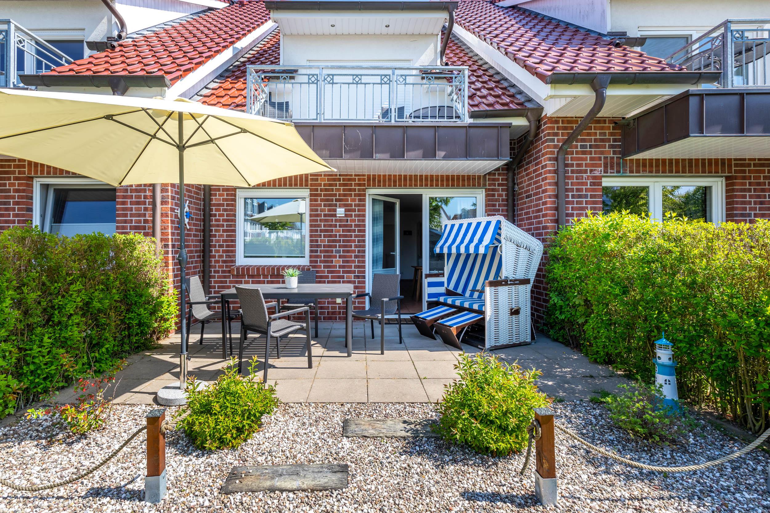 Gemütliche 2-Zimmer-Ferienwohnung mit WLAN die für 3 Gäste in Boltenhagen Zentrum durch ihre Lage im Erdgeschoss mit Südterrasse für Paare, Senioren oder Haustierbesitzer bestens geeignet ist.