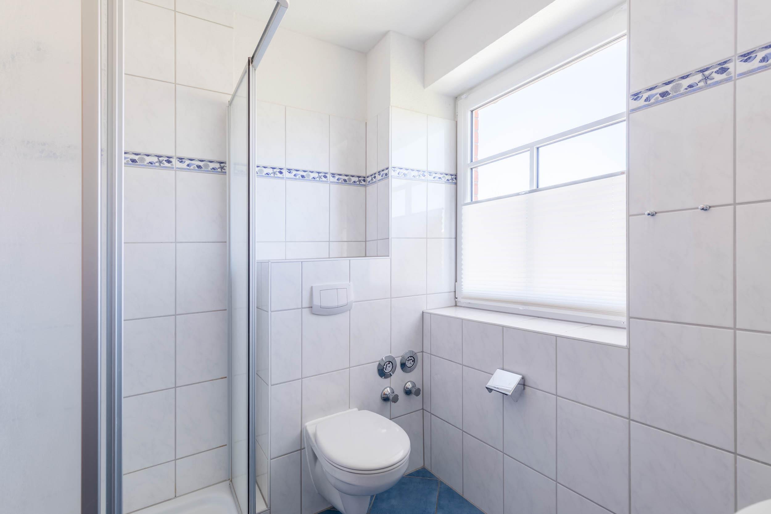 Das helle Bad mit Fenster ist mit einer Dusche, Waschbecken und WC ausgestattet.