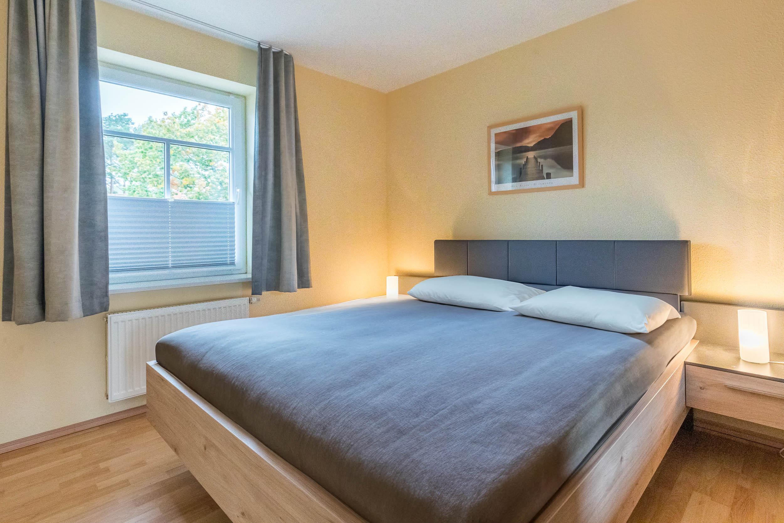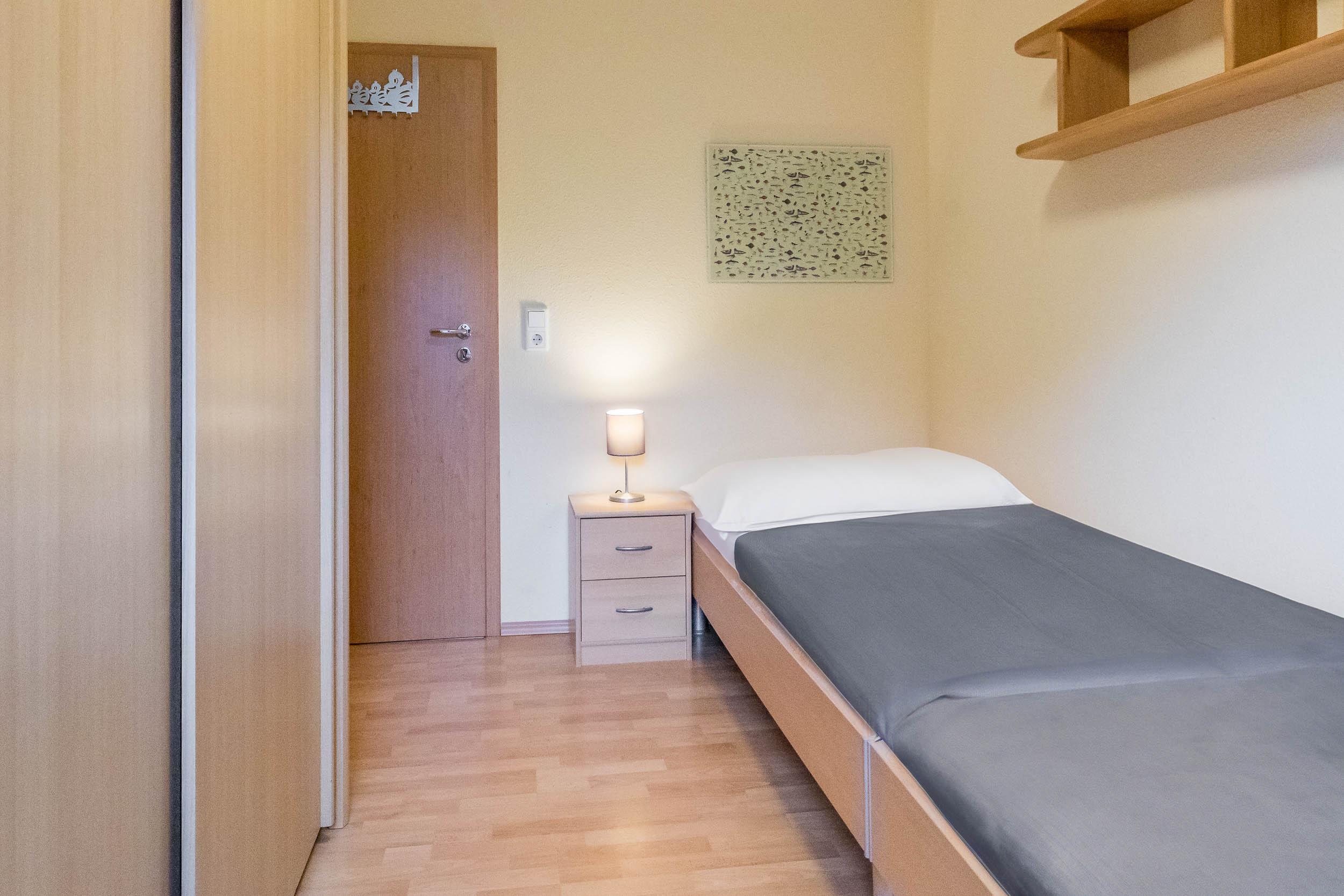 Die Wohnung bietet sowohl ein Schlafzimmer mit Doppelbett und Kleiderschrank als auch ein Gäste-/ Kinderzimmer mit 2 Einzelbetten und Kleiderschrank.