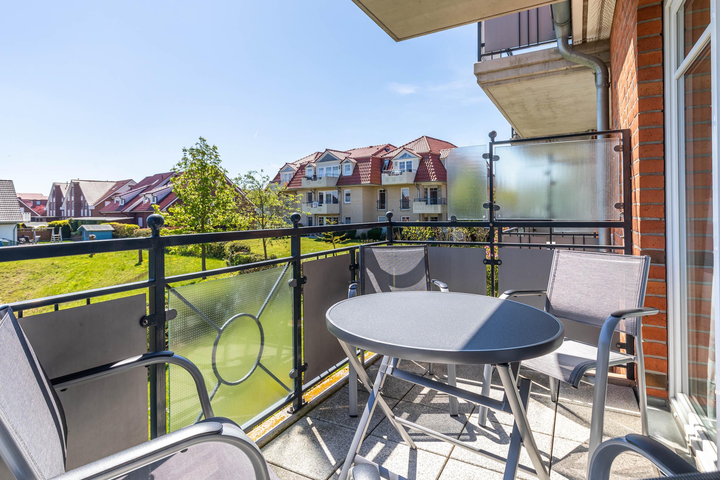 Von hier aus gelangen Sie auch auf den möblierten Südost-Balkon mit schönem Blick auf die gepflegte Grünanlage.