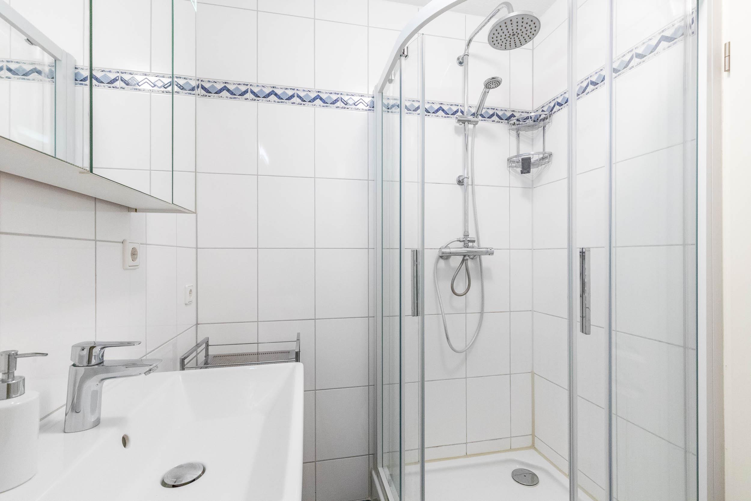 Das Bad beinhaltet eine Dusche, ein WC, einen Föhn und einen Handtuchtrockner.