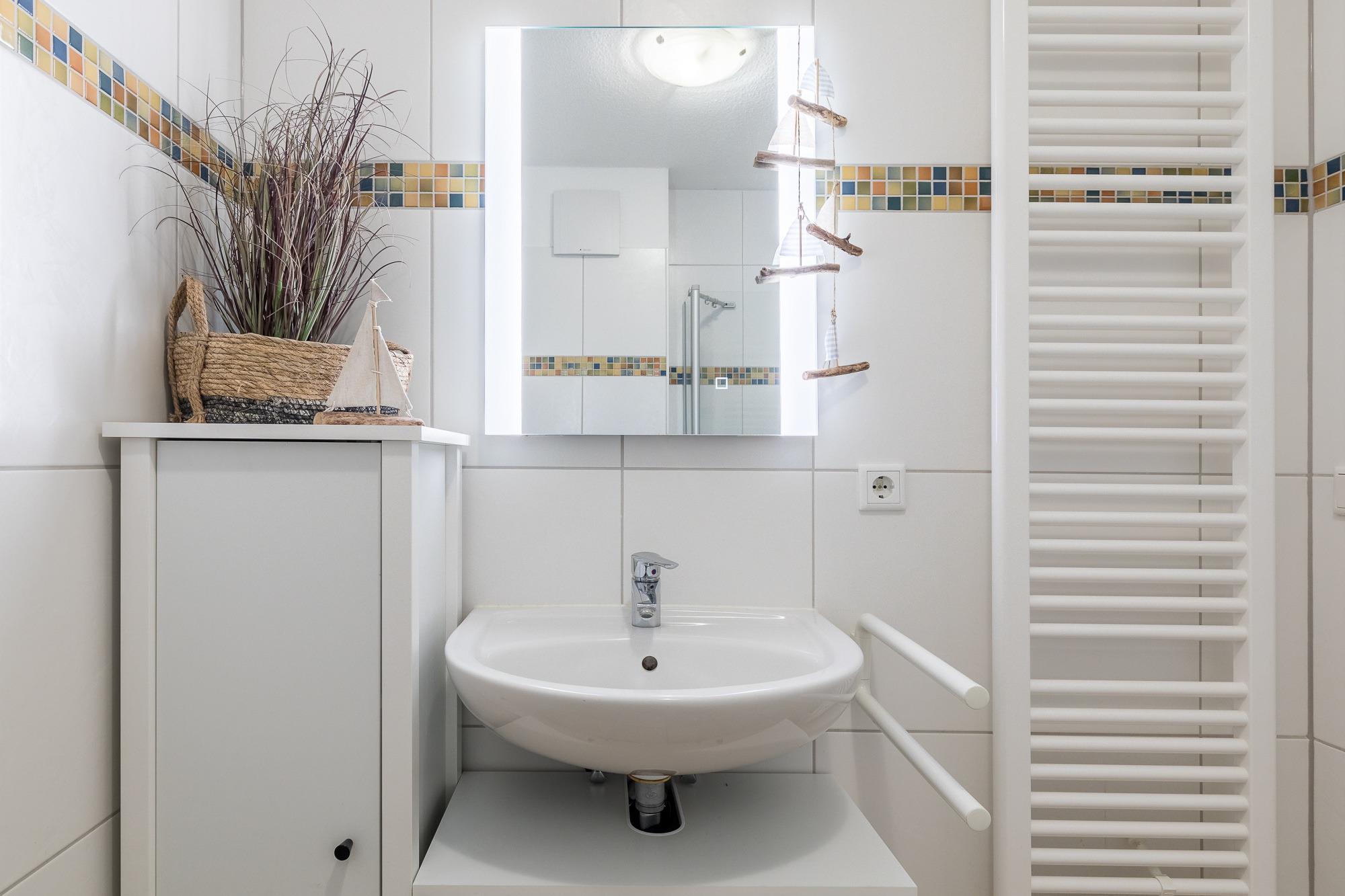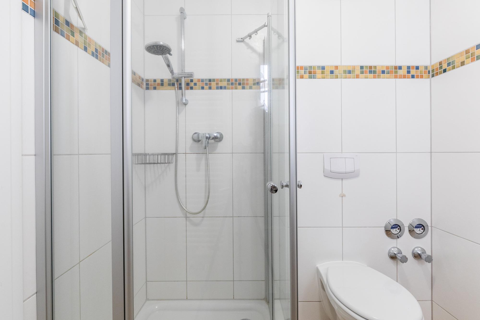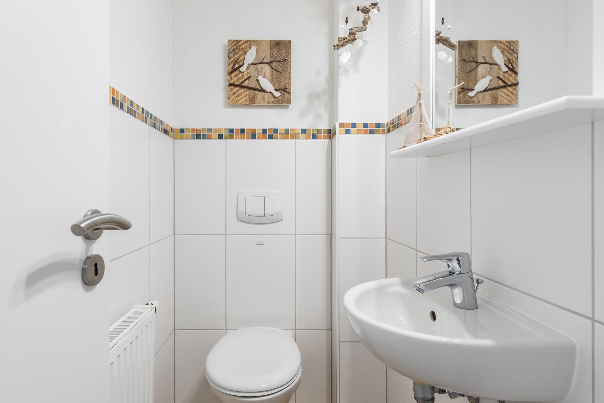 Zur Wohnung gehören zudem ein hellgefliestes, modernes Bad mit Dusche/ WC sowie ein separates Gäste-WC.