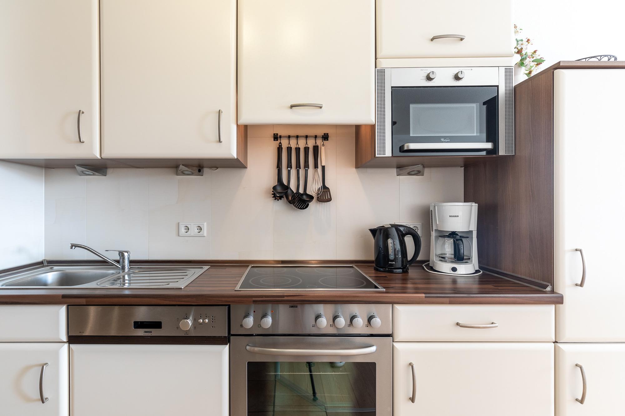 Die offene Wohnküche mit angeschlossener Essecke ist voll ausgestattet. Es gibt unter anderem eine Spülmaschine, eine Mikrowelle und einen Herd mit Backofen.
