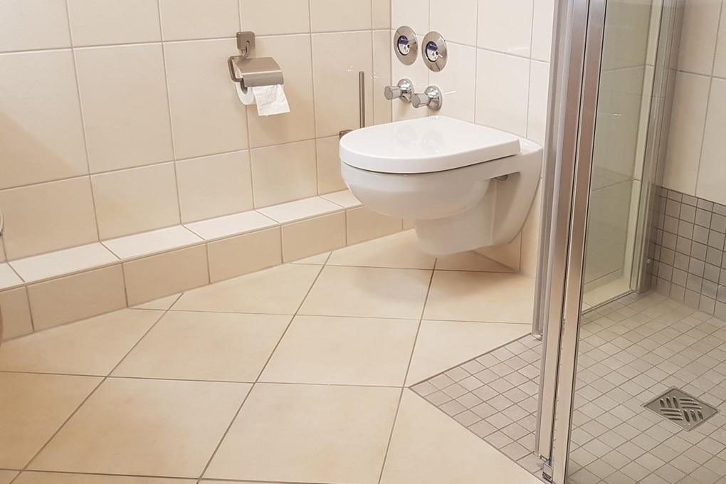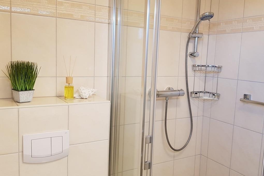 Das modern eingerichtete Duschbad ist u. a. mit einer bodengleichen Dusche ausgestattet.