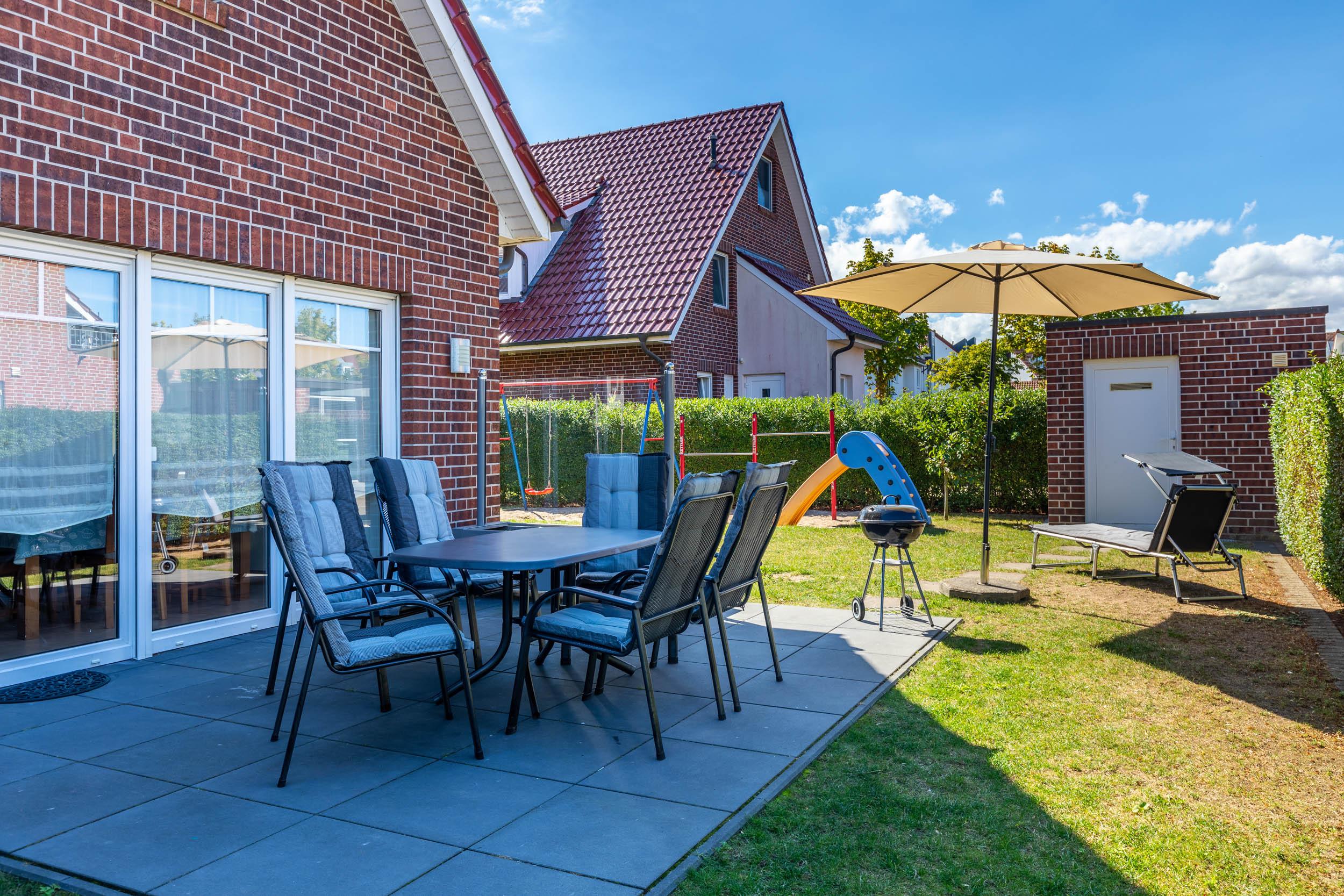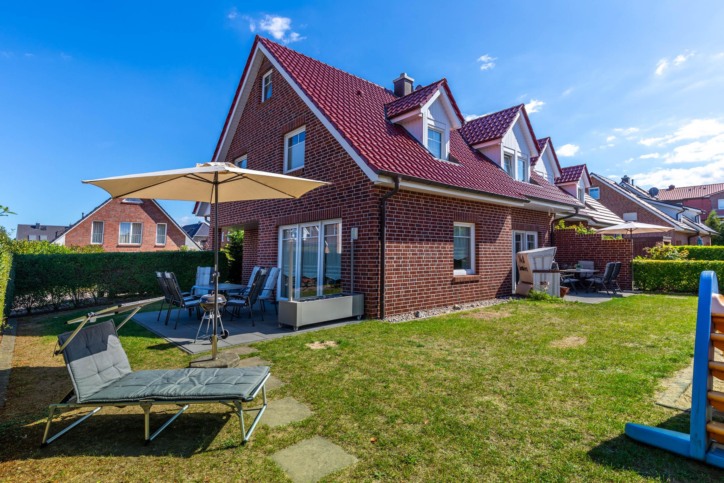Über die geschützte möblierte Nordwest-Terrasse, u.a. mit einem Strandkorb, gelangen Sie in den Garten mit einem privaten Kinderspielplatz, welchen sich die Haushälften 14a und 14b teilen.