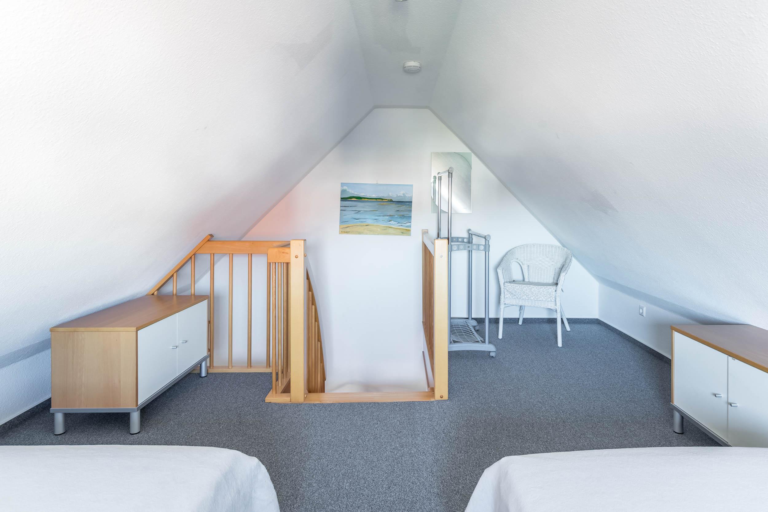 Ganz oben, im Dachgeschoss als 3. Ebene, ist eine offene Galerie mit 2 Einzelbetten und einer Kommode eingerichtet.