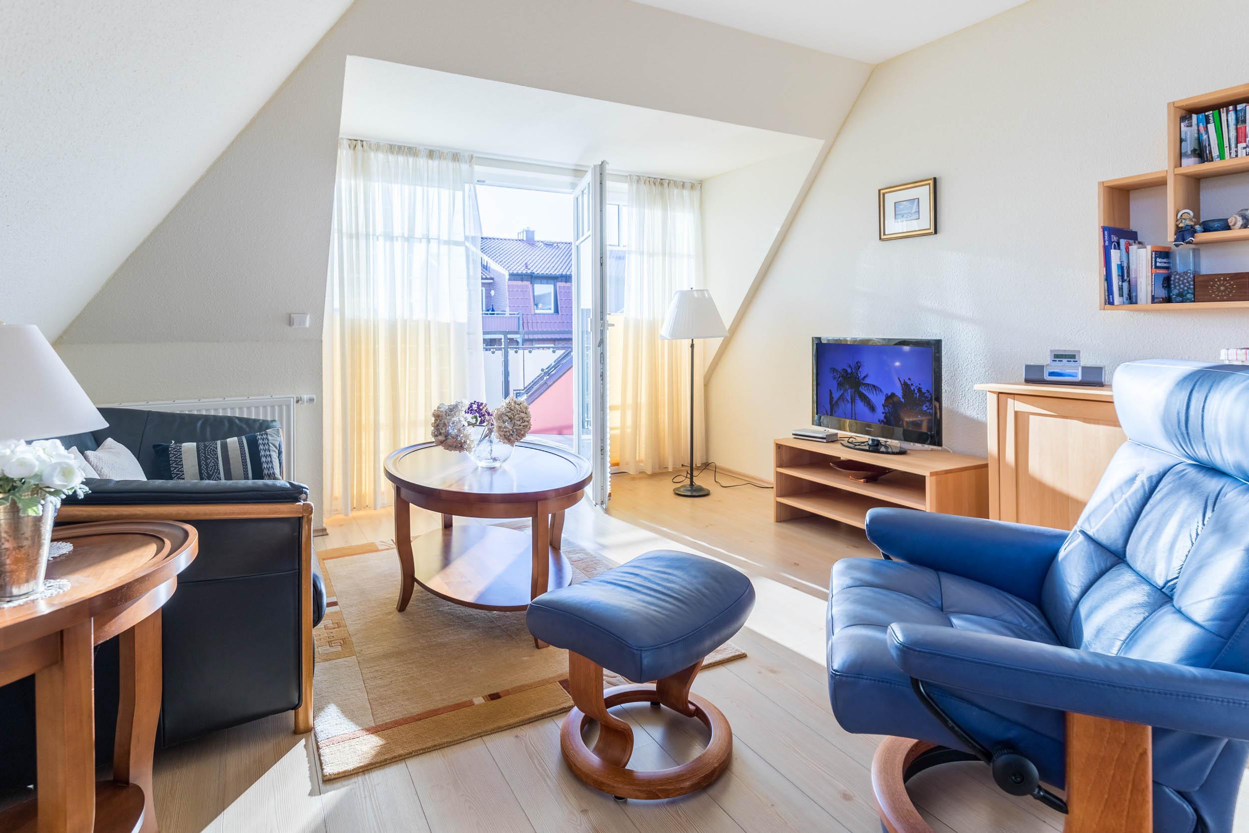 Das hell eingerichtete Wohn- und Esszimmer verfügt über ein gemütliches Sofa und einem passenden Sessel sowie einen schönen Essbereich mit direktem Zugang zu den beiden möblierten Balkonen (Südost und Südwest). Ein Flatscreen-TV und eine kleine Musikanlage dienen hier zu Ihrer Unterhaltung.