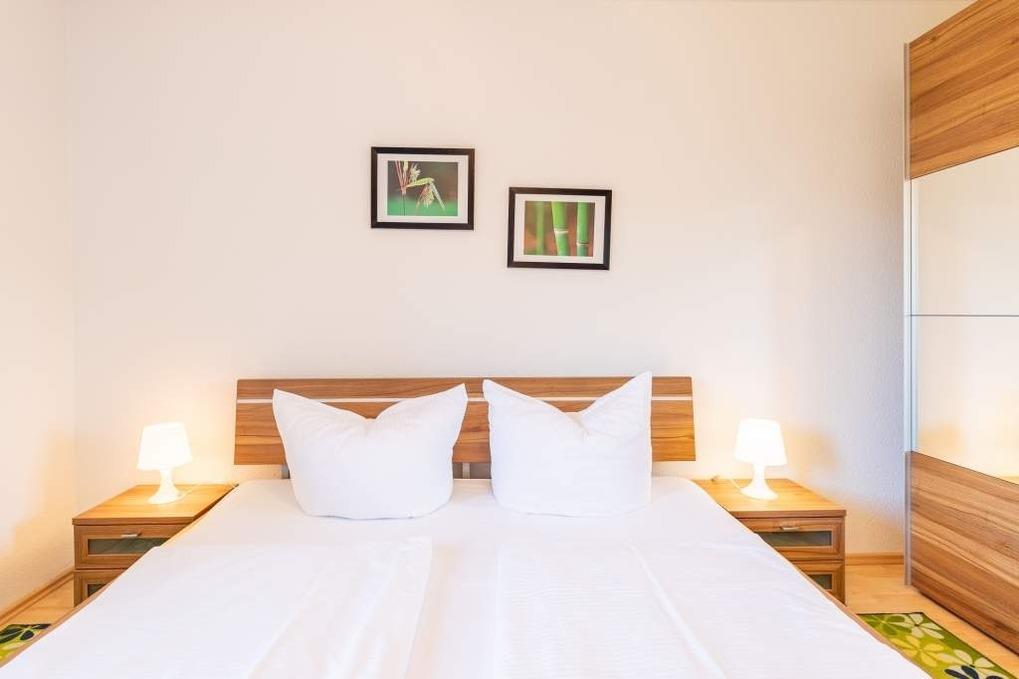 Zum Schlafen bietet die Wohnung ein Schlafzimmer mit Doppelbett, Kleiderschrank und LED Smart TV sowie ein Gäste-/ Kinderzimmer mit zwei Einzelbetten, Kleiderschrank und Schreibtisch.