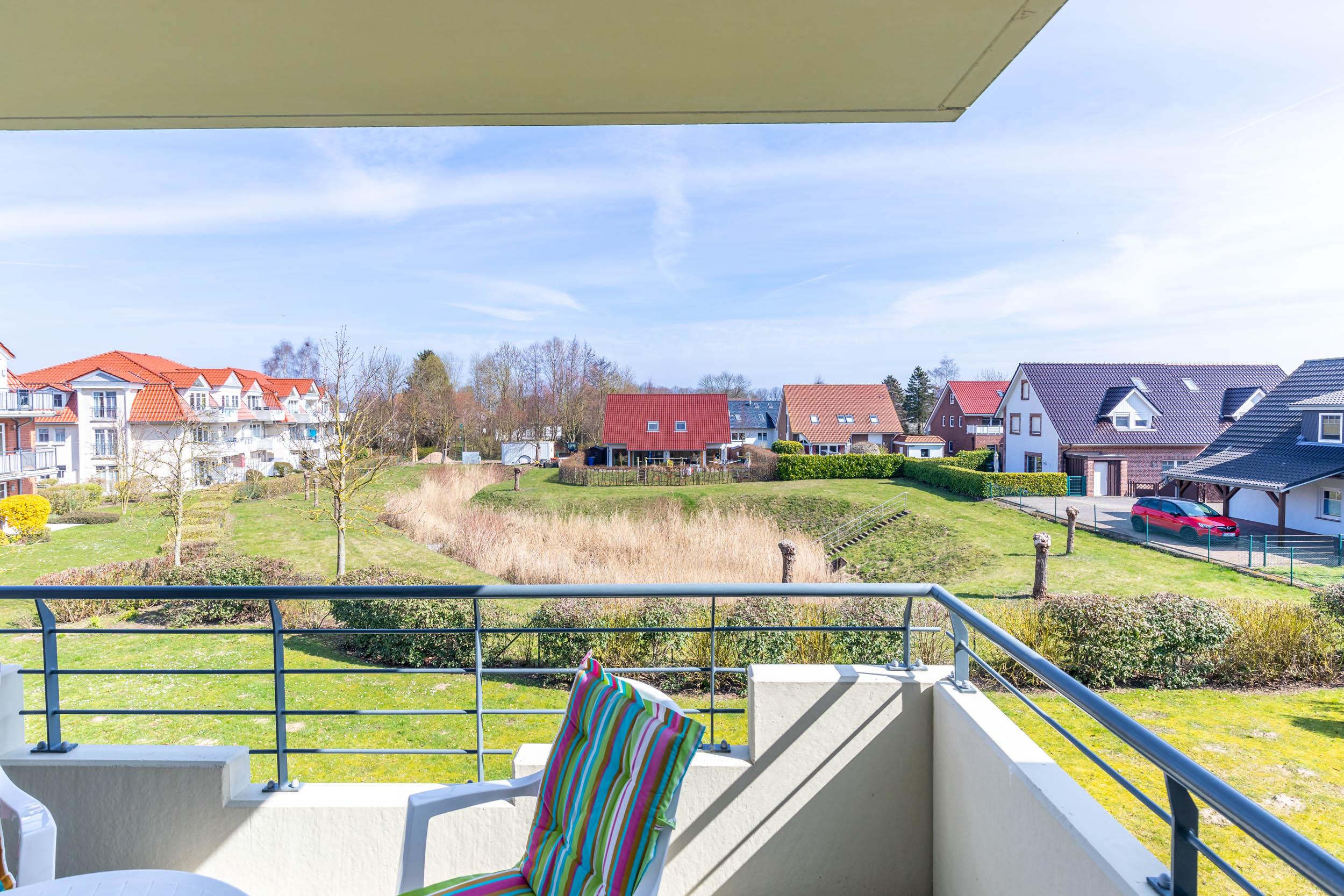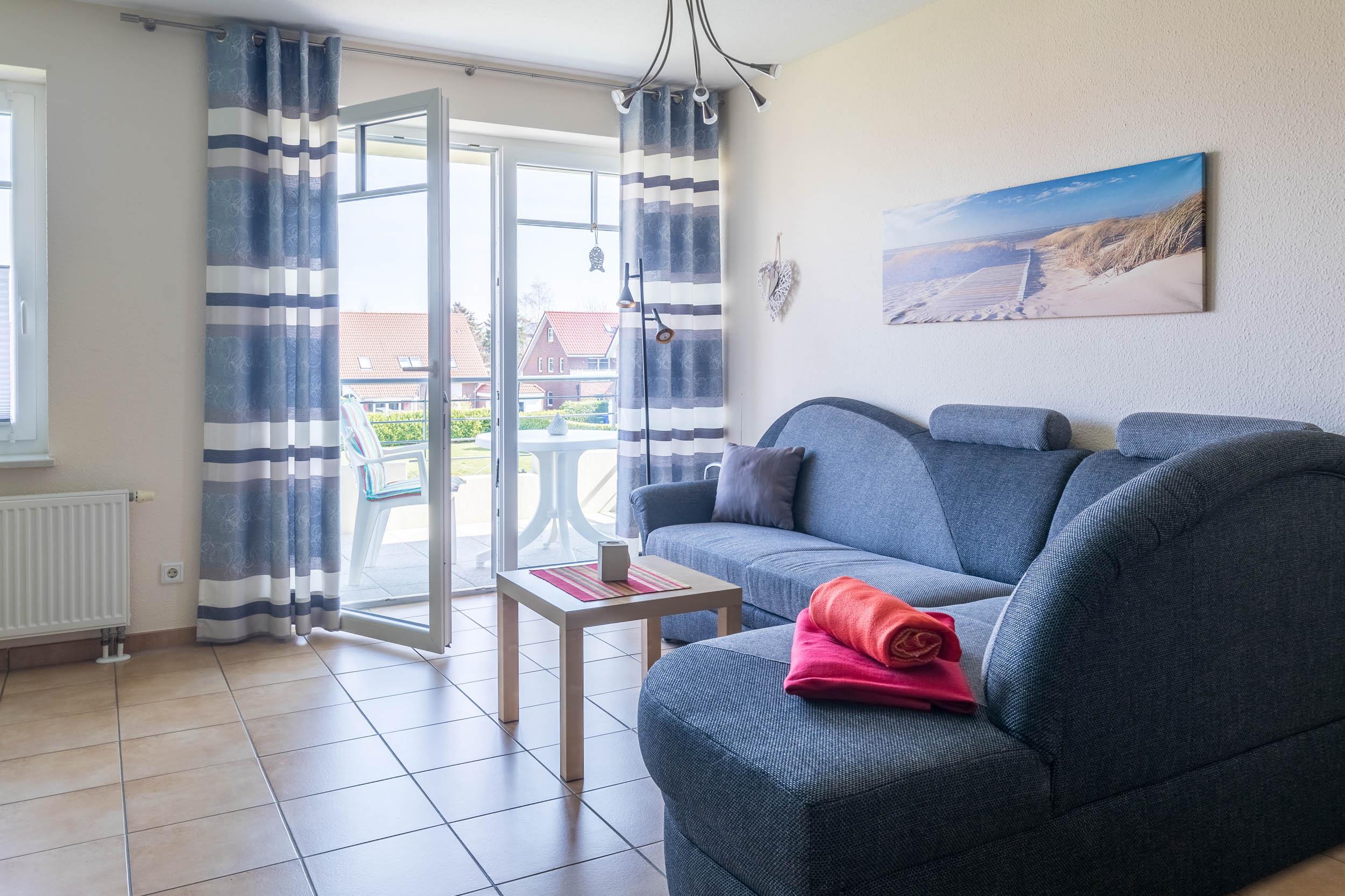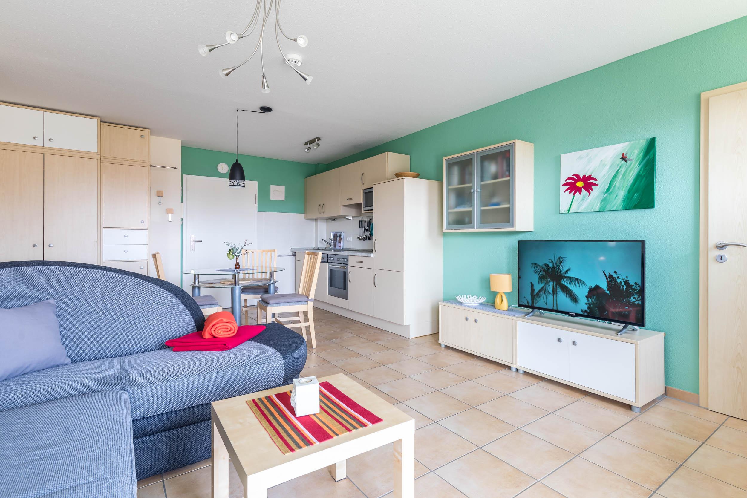 Der helle Wohnbereich verfügt unter anderem über Sat-TV, ein CD Radio sowie einen direkten Zugang auf den möblierten Nordost-Balkon, der mit einen reizvollen Blick ins Grüne einlädt.