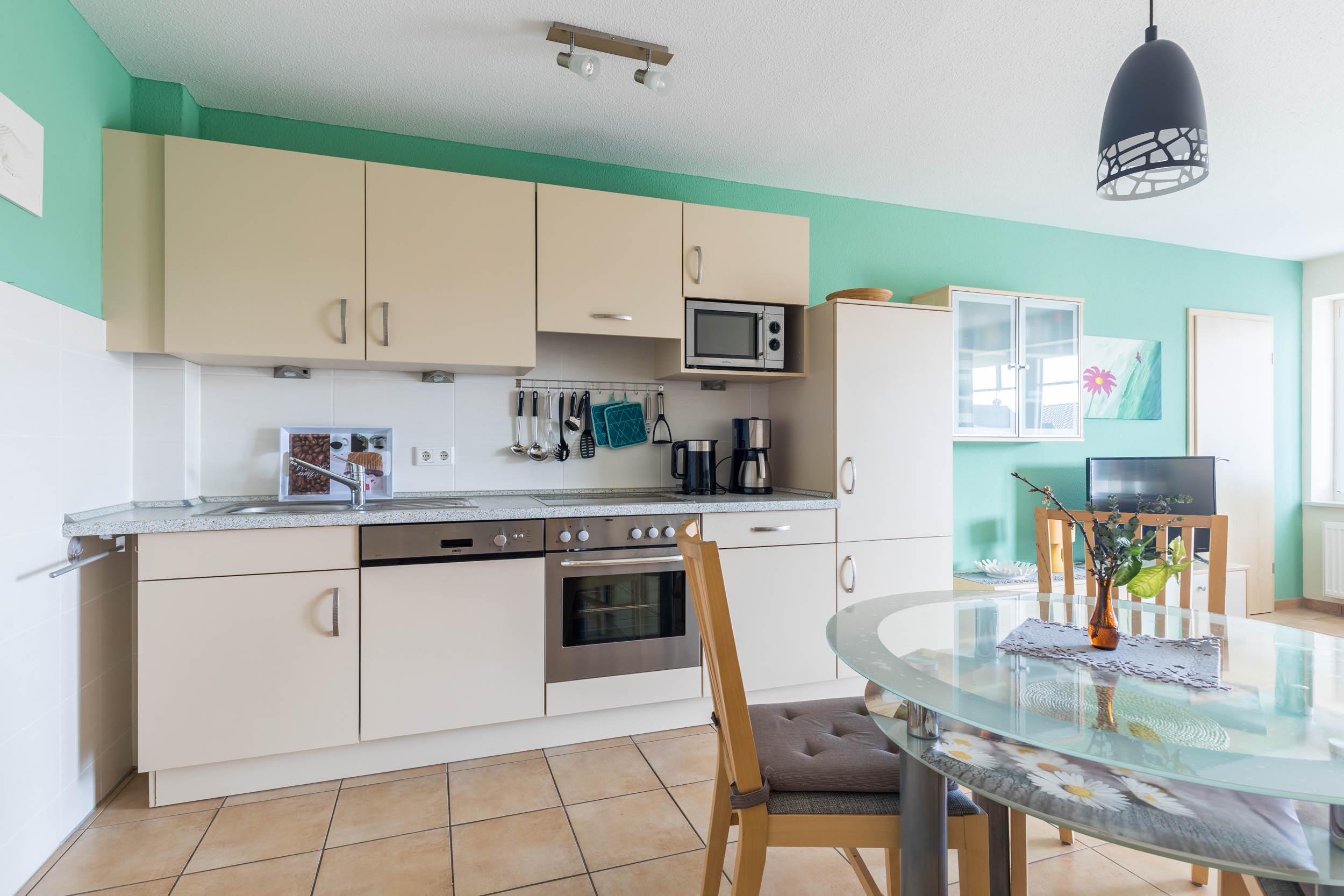 In der offen gehaltenen modernen Wohnküche erwartet Sie eine komplette Ausstattung inklusive Spülmaschine für Ihre Selbstverpflegung. An der separaten Essecke können Sie gern gemeinsam speisen.