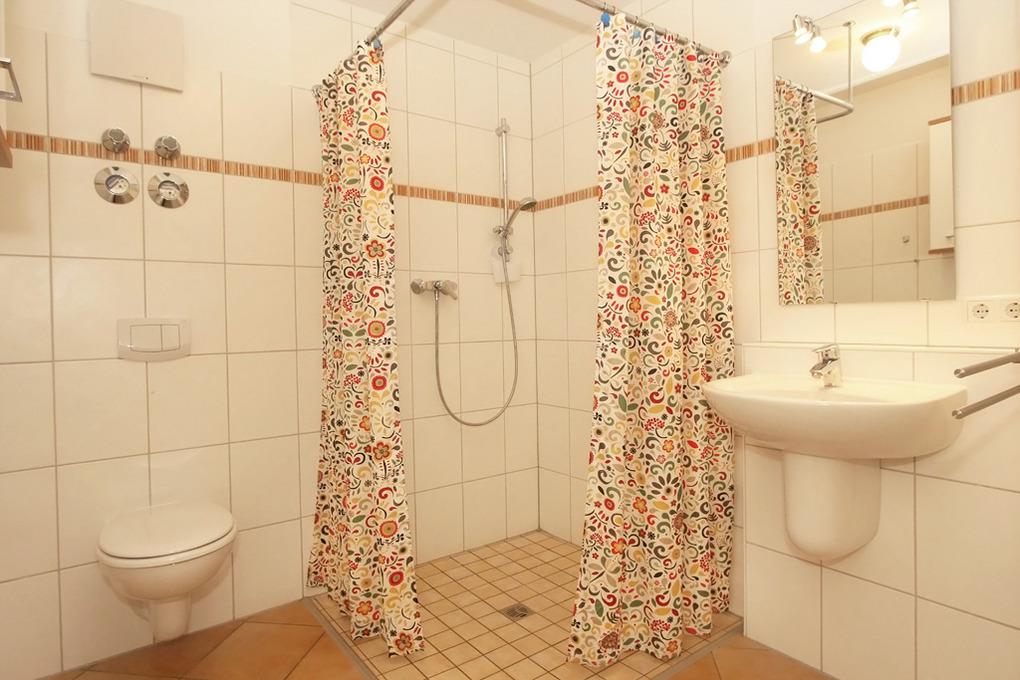 Sowohl das Badezimmer mit bodengleicher Dusche, Duschhocker und WC als auch das Schlafzimmer mit Doppelbett und Kinderreisebett können mit einem Rollstuhl befahren werden.