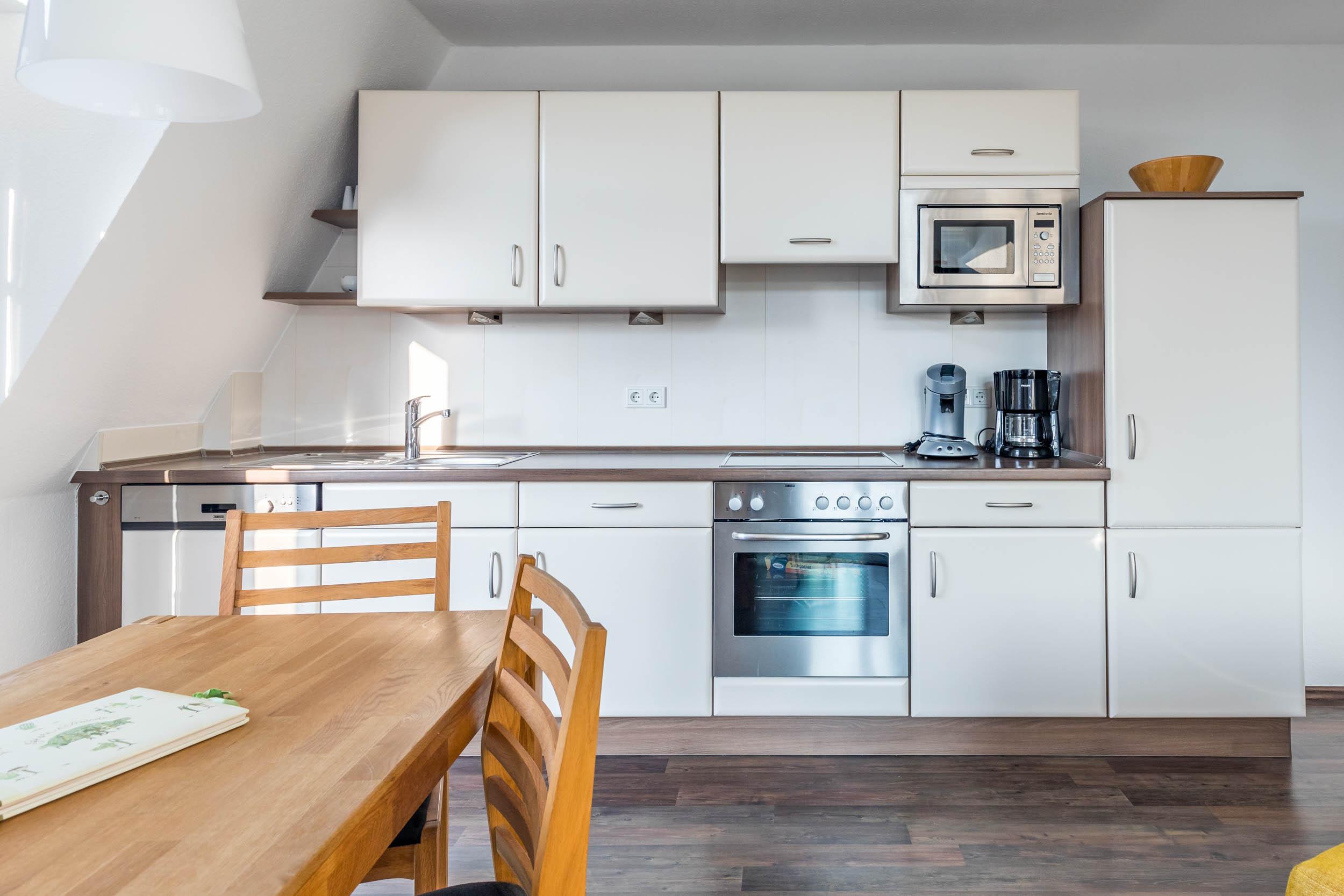 Die Wohnküche mit offener Küchenzeile und bequemer Essecke lädt zu gemütlichen Mahlzeiten ein. Zu den hilfreichen Haushaltsgeräten gehören u.a. eine Mikrowelle und ein Geschirrspüler.