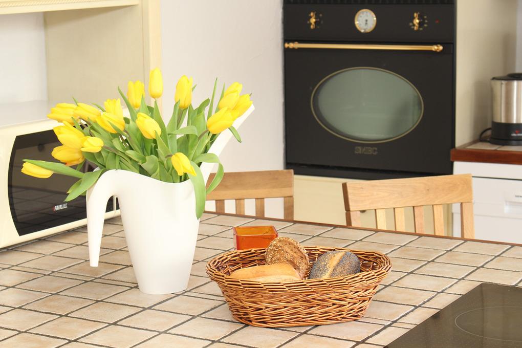 In der offenen Küche gibt es vielerlei hilfreiche Geräte für Ihre Selbstverpflegung - von der Mikrowelle bis zum Geschirrspüler - und eine Essecke an der Kochinsel.