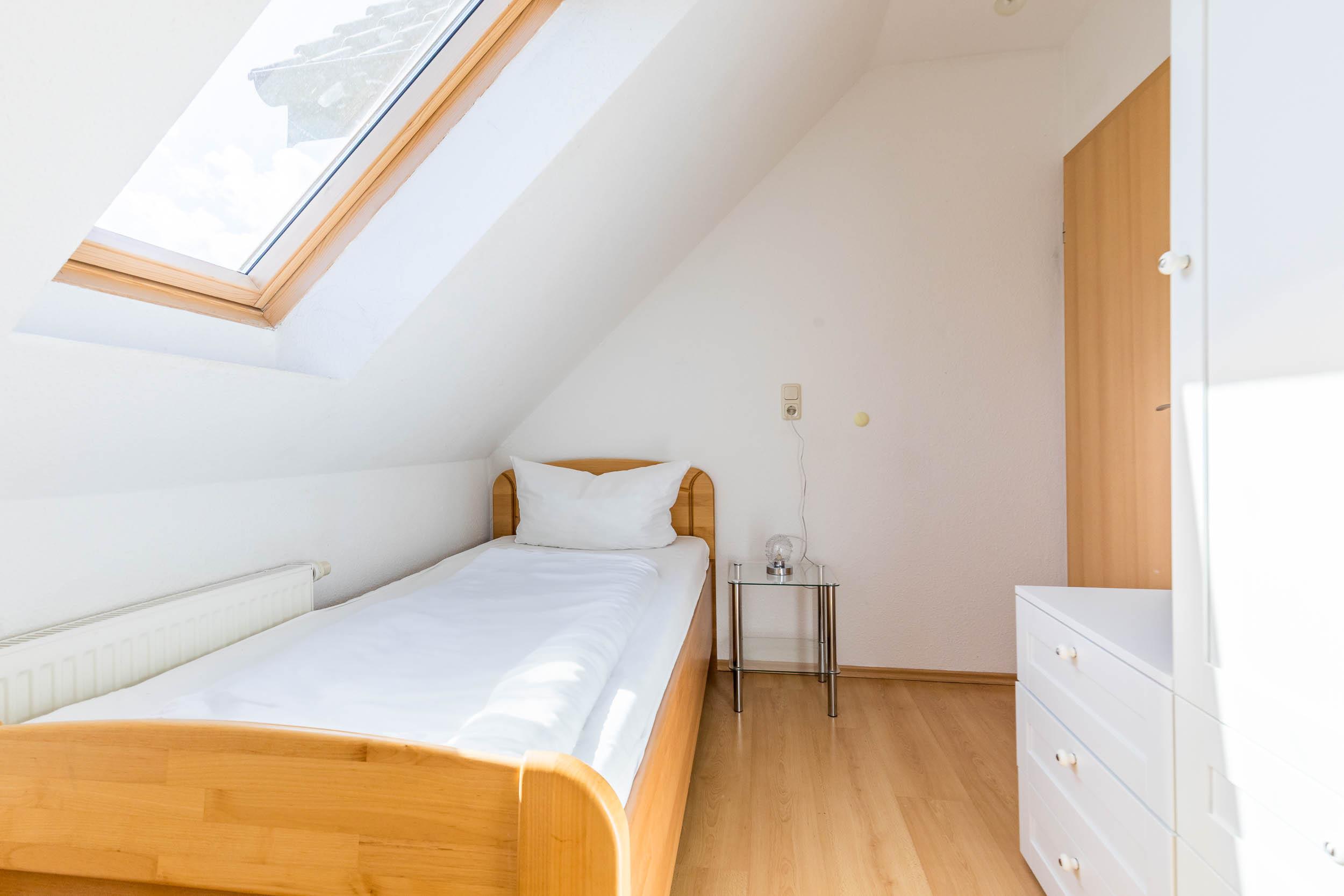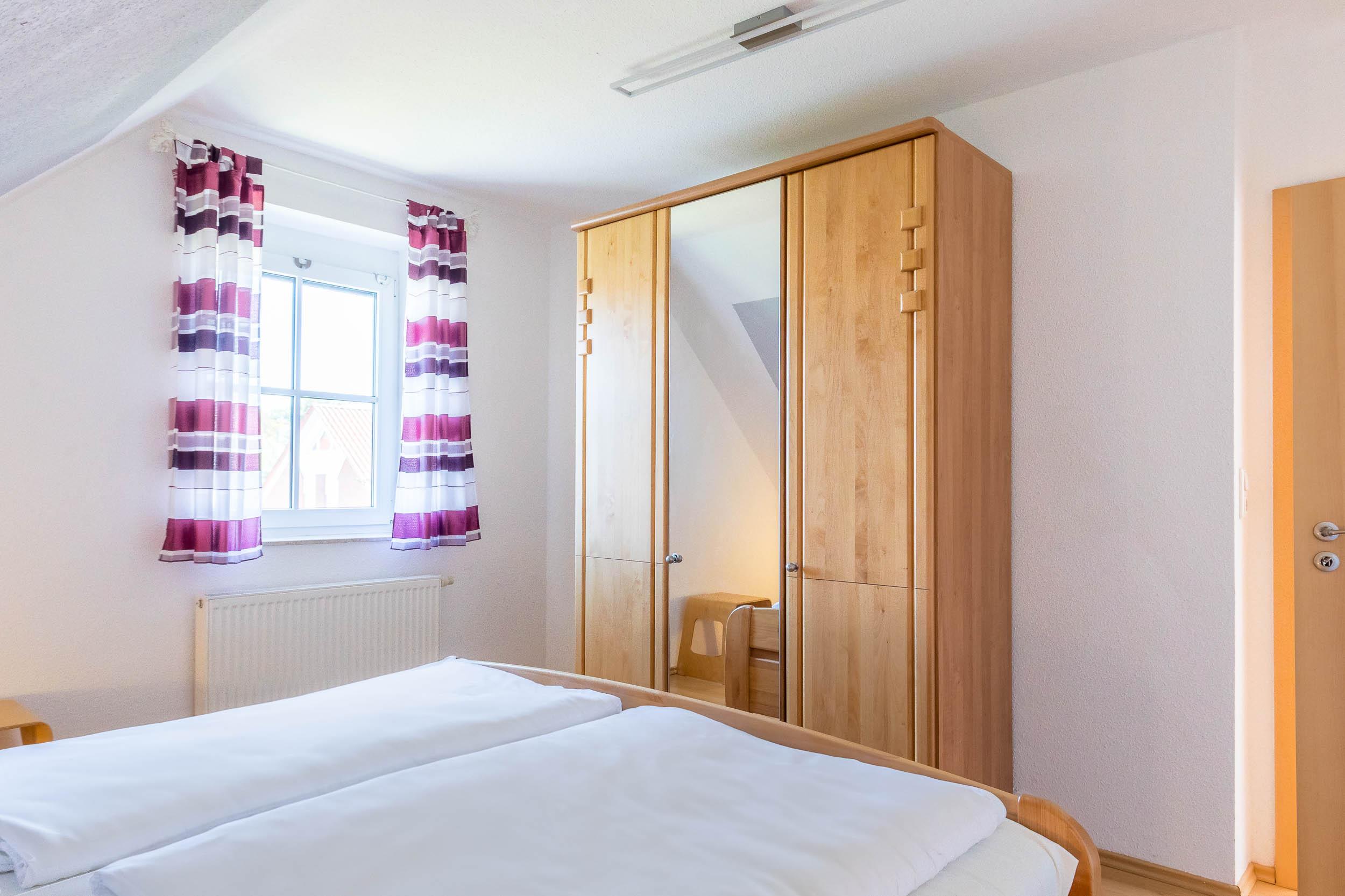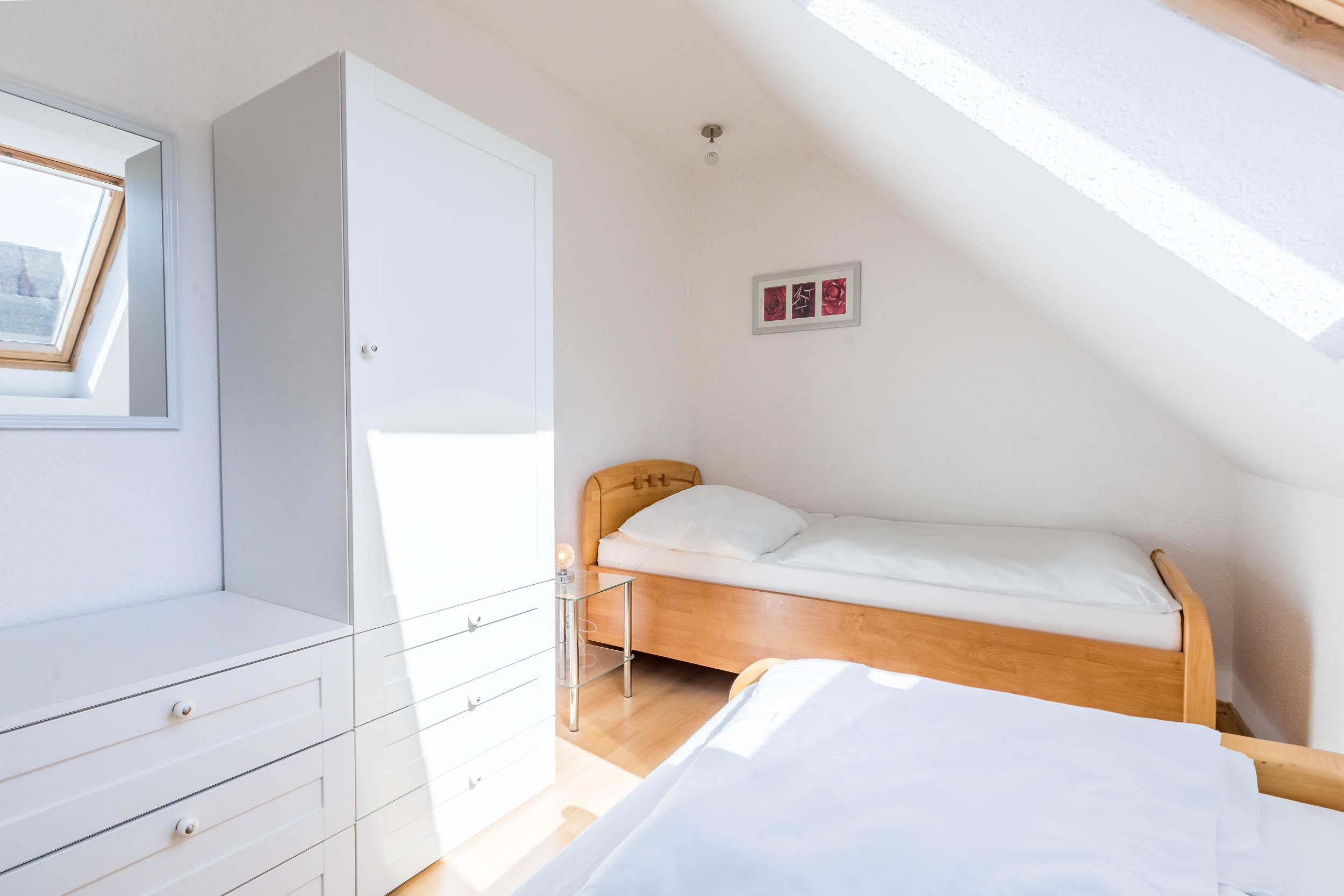 Das Schlafzimmer ist mit einem großzügigen Doppelbett (180x200cm/ Höhe 57cm) und einem Kleiderschrank ausgestattet, im Gäste-/ Kinderzimmer stehen Ihnen zwei Einzelbetten (je 90x200cm/ Höhe 57cm) und ebenfalls ein Kleiderschrank zur Verfügung. Alle Betten haben einen verstellbaren Lattenrost.