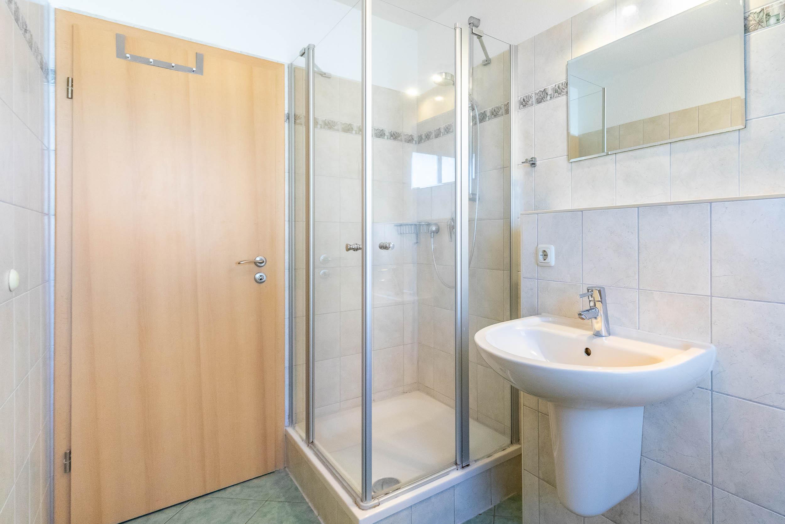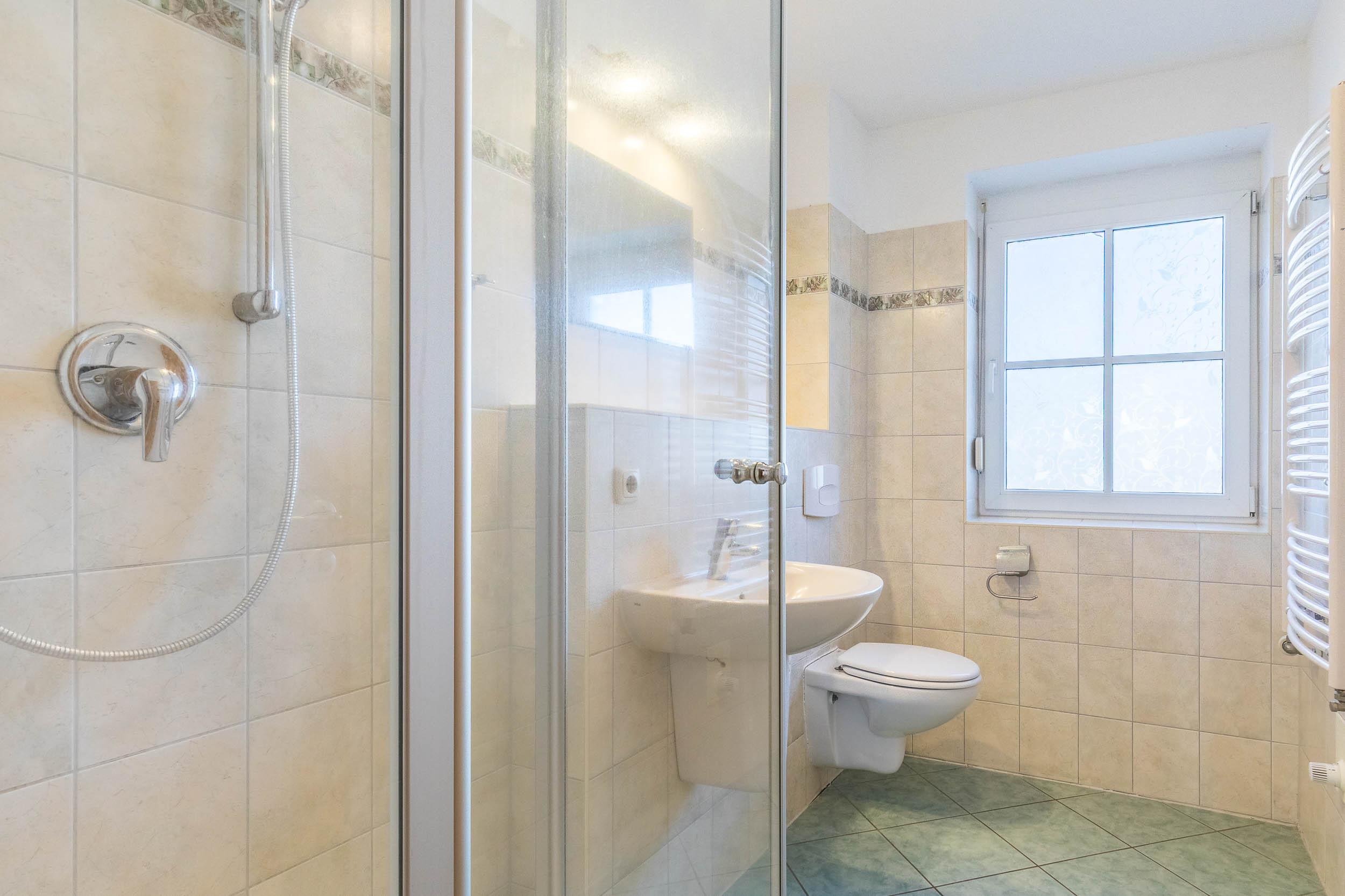Das Badezimmer bietet eine Dusche, ein WC und einen Föhn. Das Fenster spendet angenehmes Tageslicht und hilft beim Lüften nach dem Duschen. Die Handtuchheizung im Bad sorgt zusätzlich für wohlige Wärme.