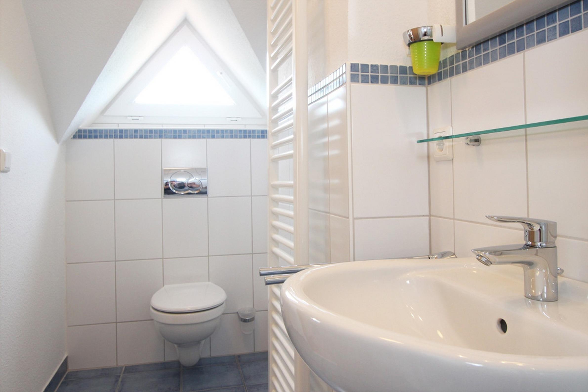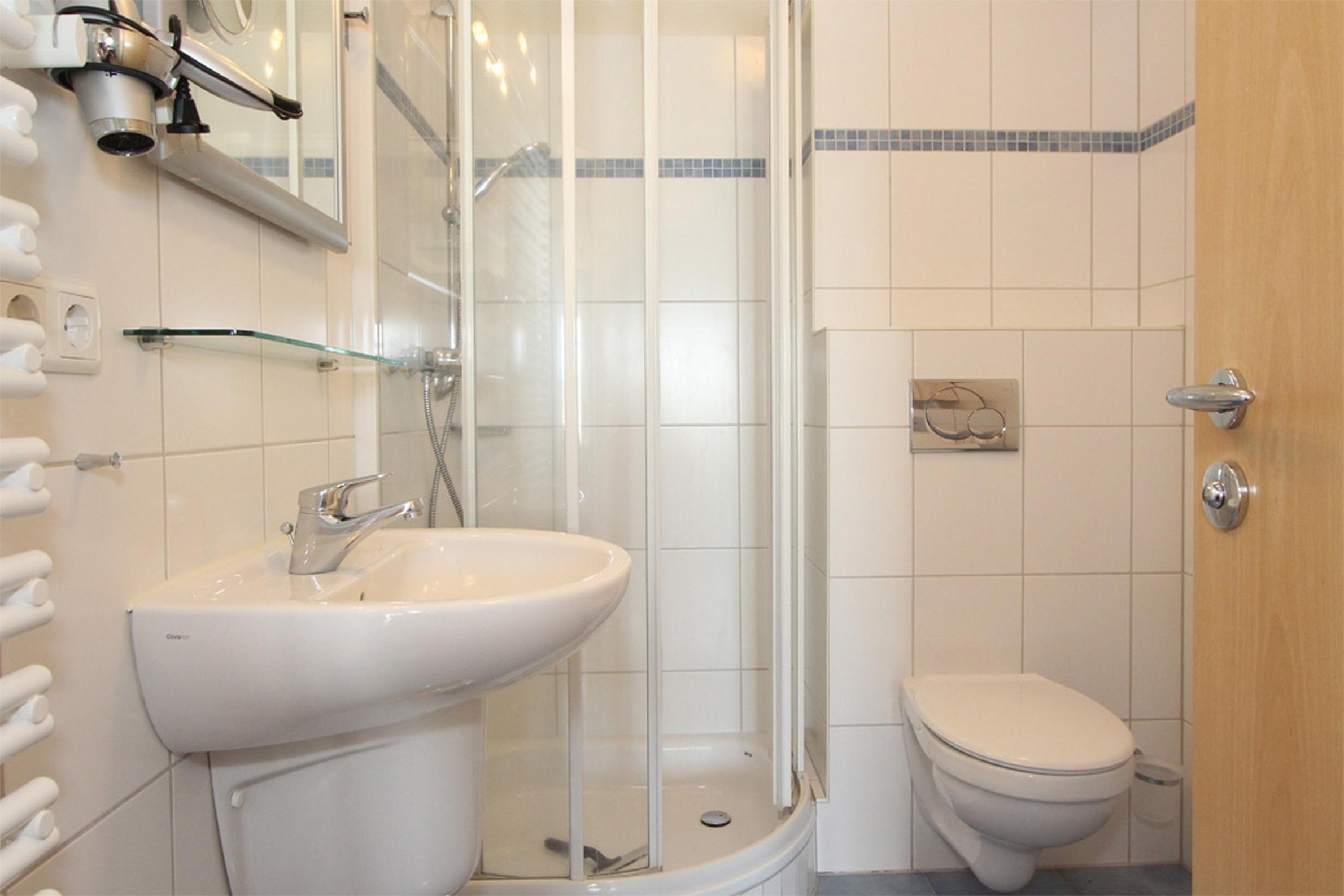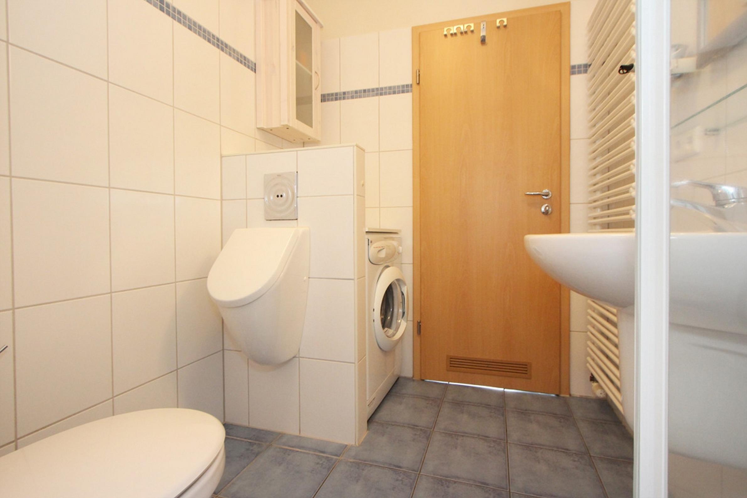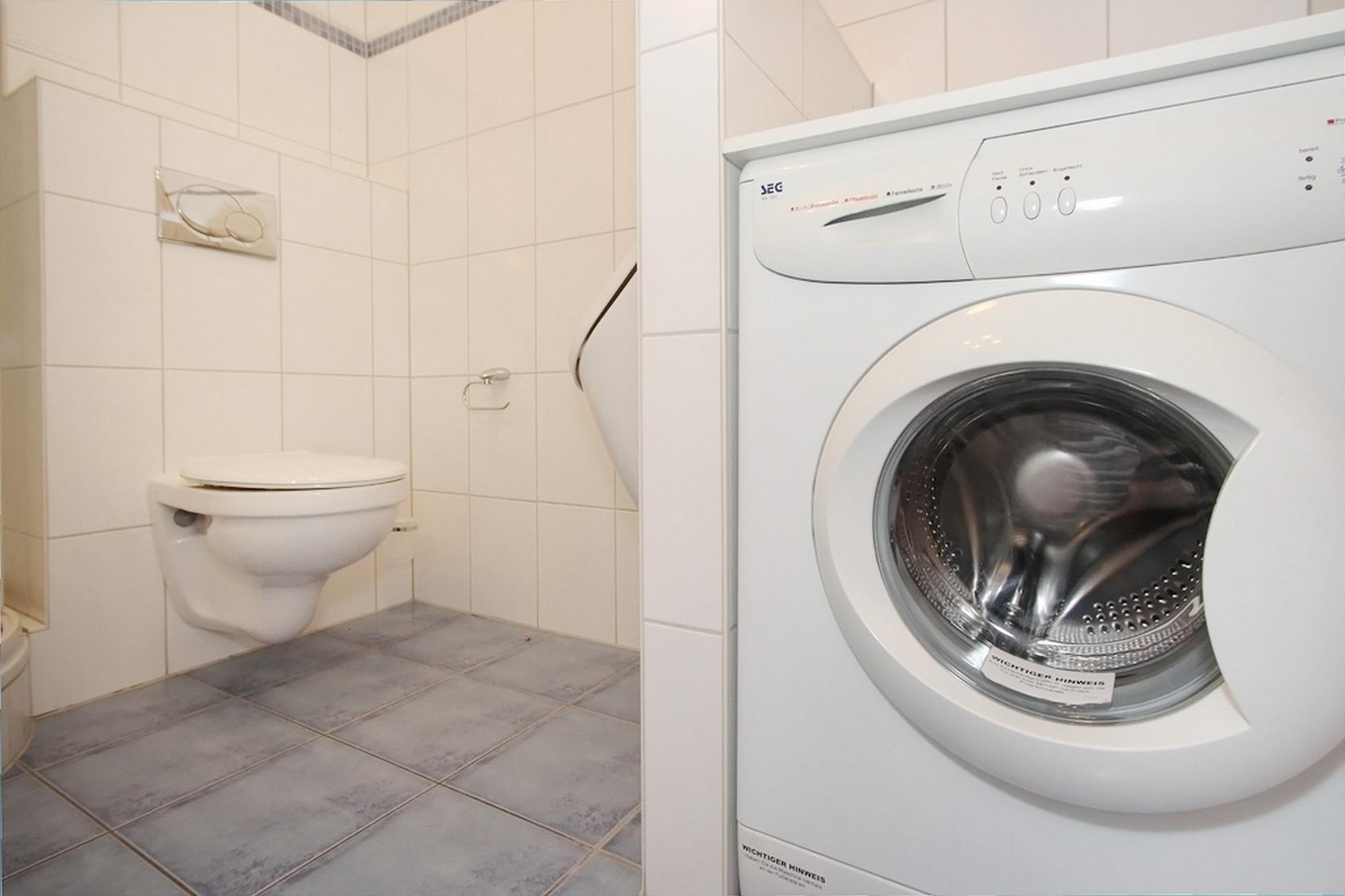 Auch eines der insgesamt zwei Badezimmer finden Sie in der ersten Etage. Dieses bietet neben Dusche und WC auch eine Waschmaschine.