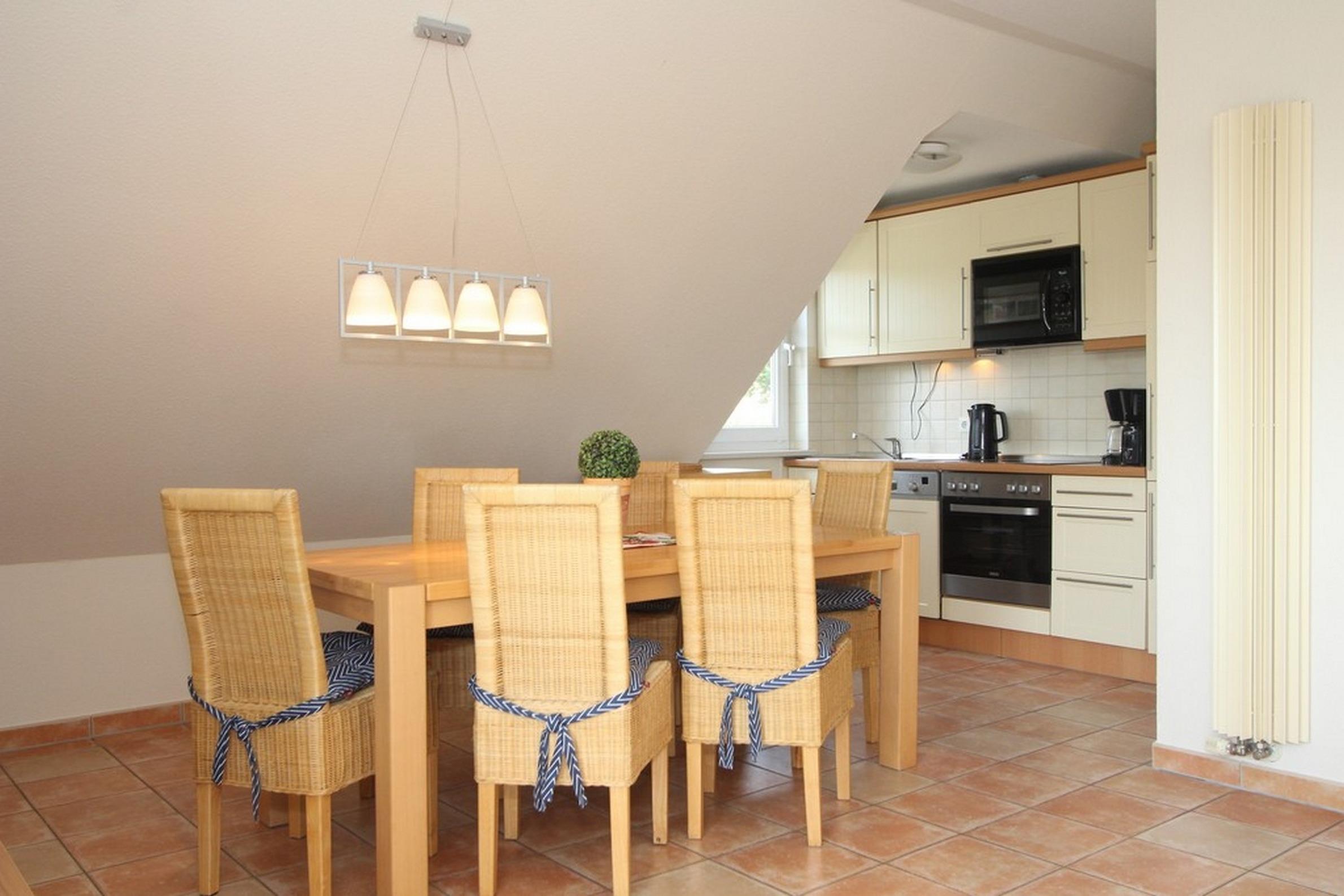 Die komfortable, offene Küchenzeile bietet eine sehr gute Ausstattung mit sämtlichen benötigten Gerätschaften für eine ideale Selbstversorgung. An der Essecke können Sie gern Ihre Speisen bequem einnehmen, Ihre Urlaubspost schreiben oder auch einen schönen Spieleabend verbringen.
