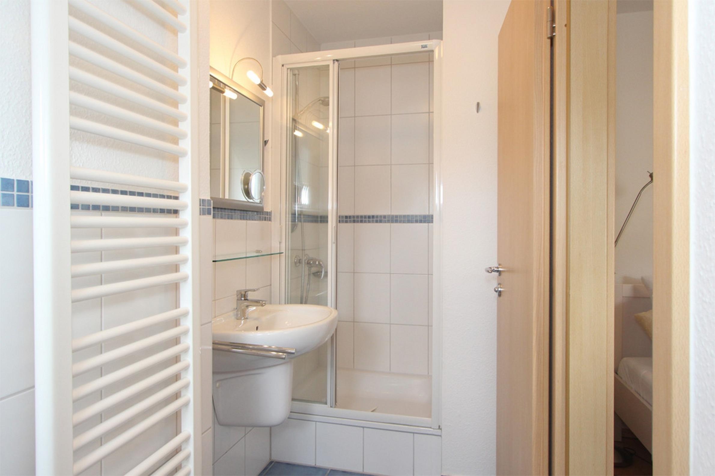 Zum zweiten Badezimmer mit Dusche und WC gelangt man durch das Schlafzimmer mit dem Doppelbett auf dieser Etage.