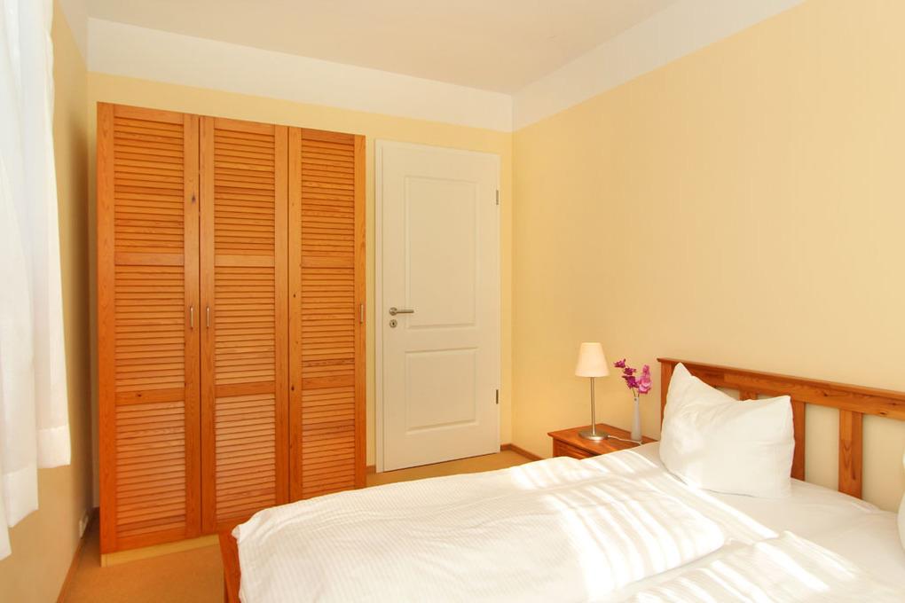 Im Schlafzimmer erwartet Sie ein gemütliches Doppelbett und ein Kleiderschrank für Ihre Garderobe.