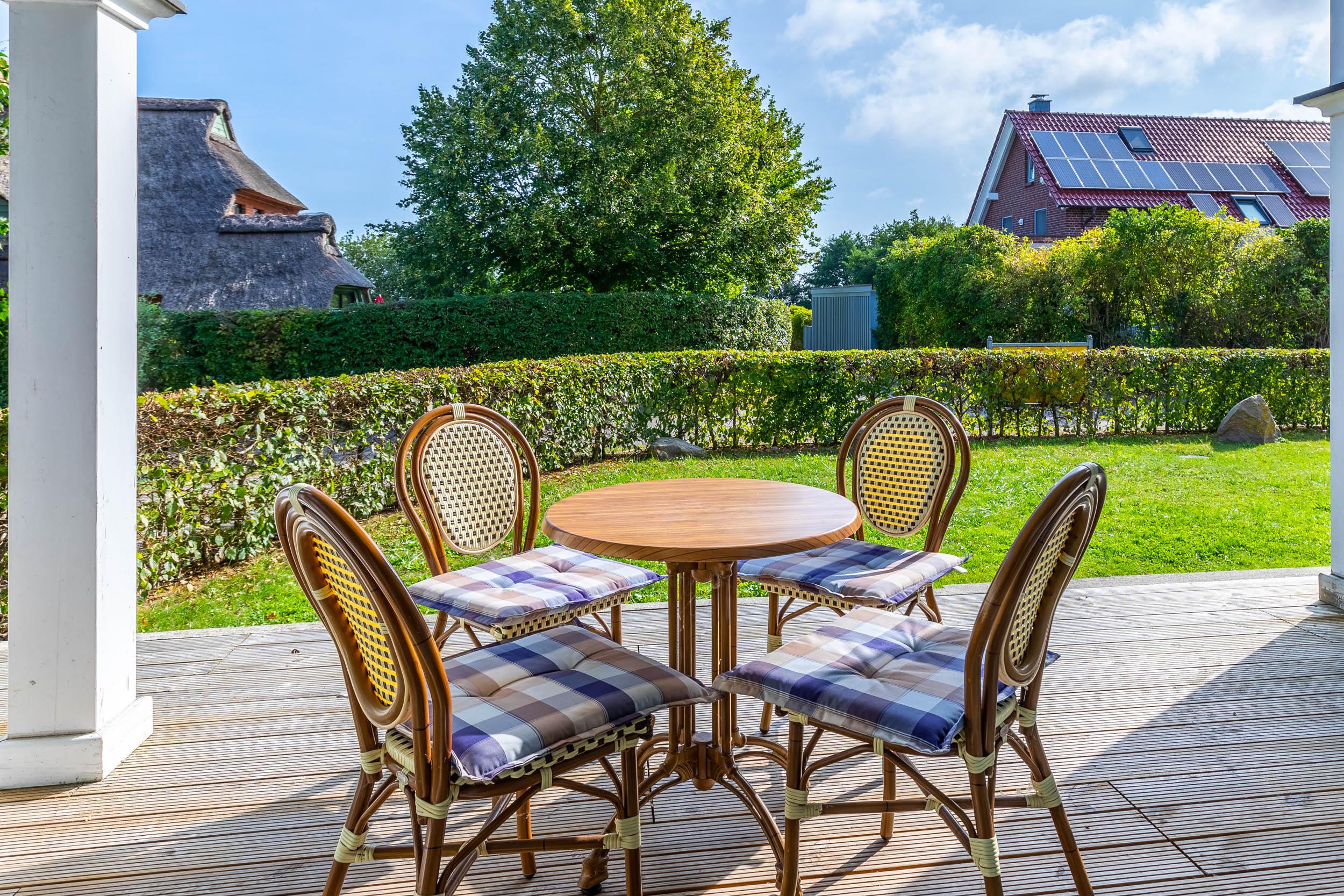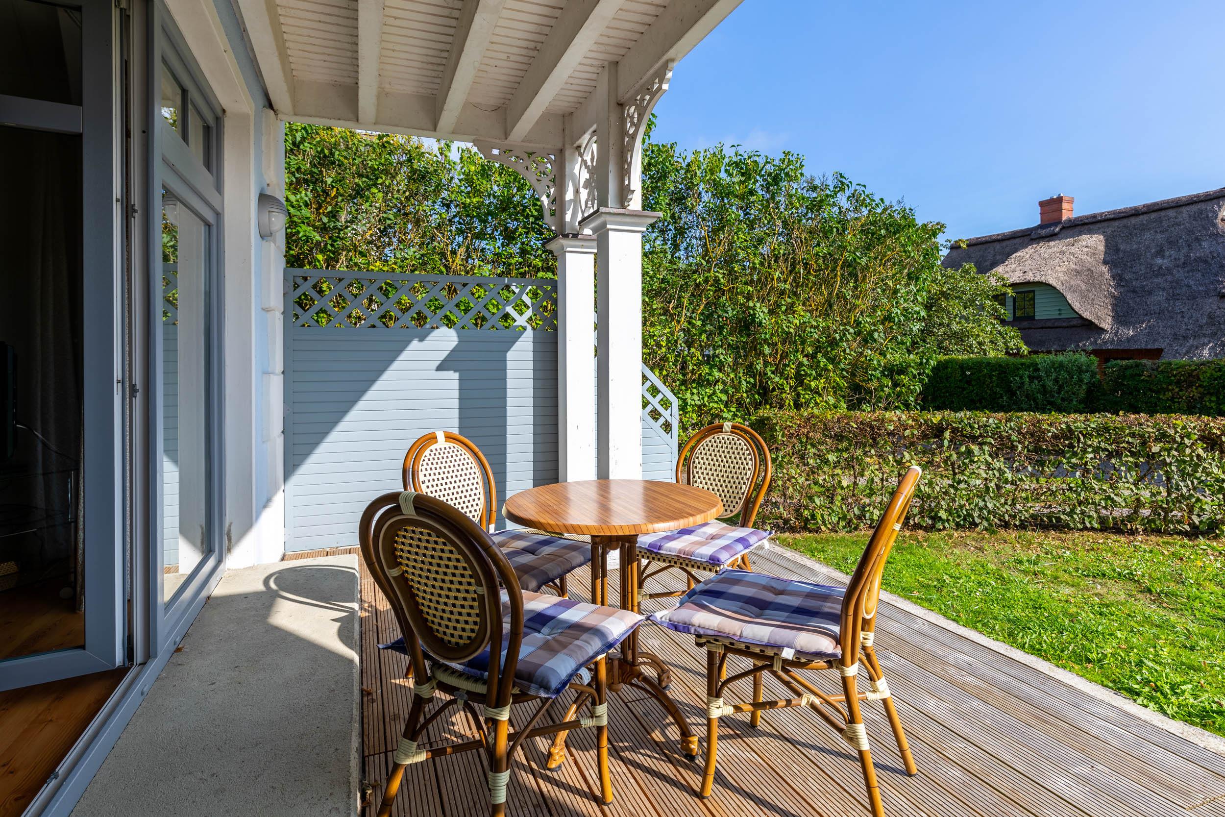 Auf der möblierten Holz-Veranda, welche zur Ostsee (Osten) ausgerichtet ist, können Sie das Meer hören, riechen, fühlen und manchmal auch sehen...