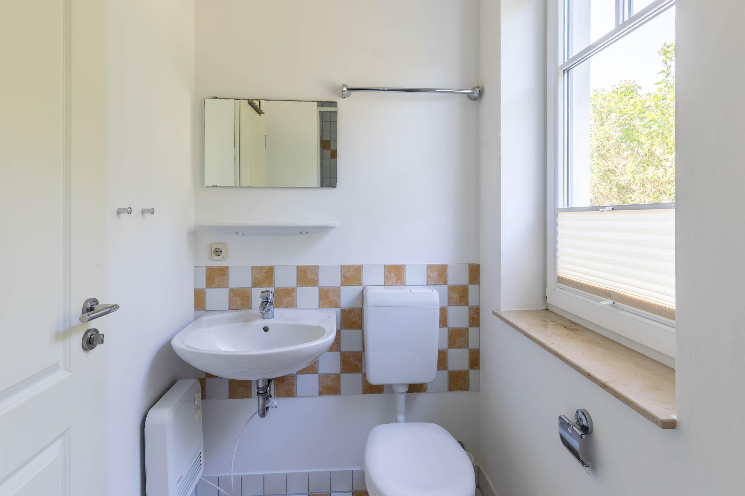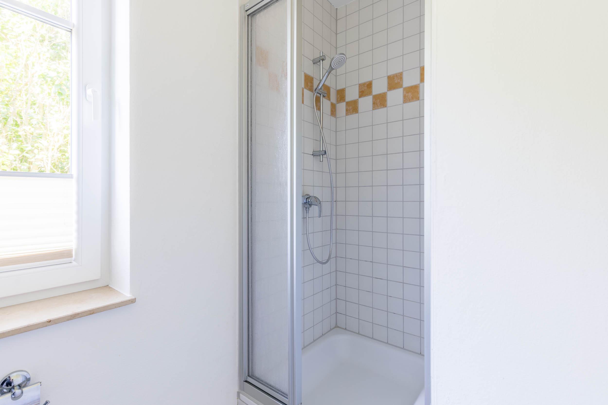 Starten Sie den Urlaubstag im hell gefliesten Bad mit Tageslicht. Es ist mit Dusche, WC und Waschbecken ausgestattet.