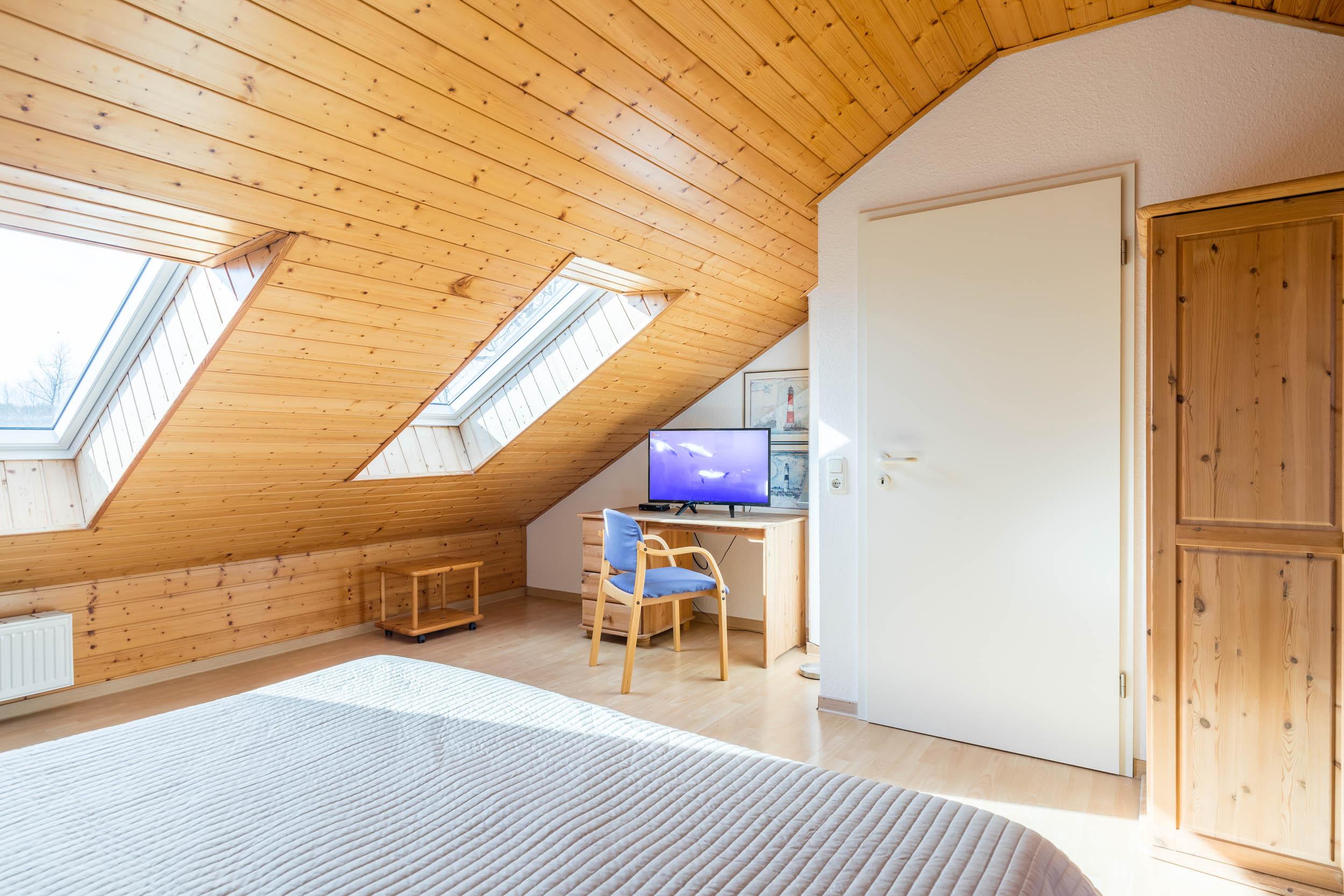 Im Dachgeschoss ist das Schlafzimmer mit einem Doppelbett und einem großzügigen Kleiderschrank eingerichtet. Ein weiterer SAT-TV sorgt auch auf dieser Etage für Unterhaltung. Hier finden Sie auch genügend Platz für ein Reisebettchen.