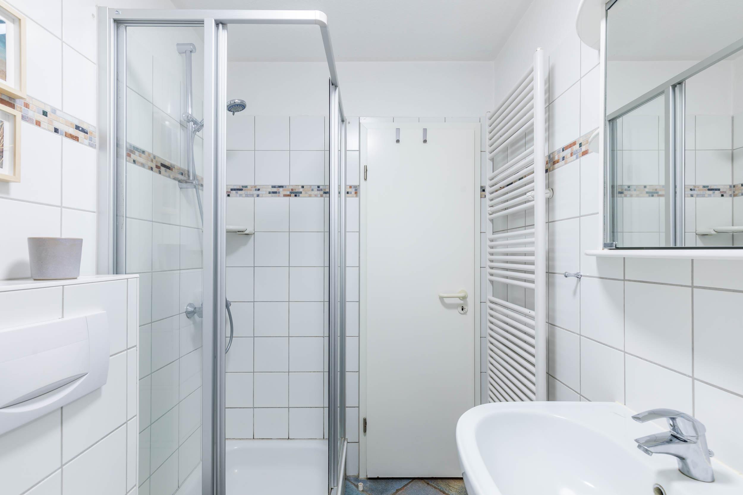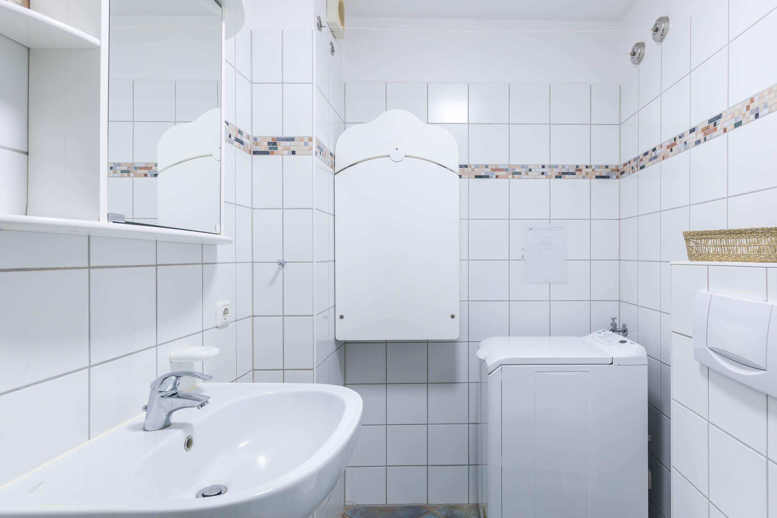 Das Badezimmer auf selbiger Etage bietet neben Dusche/WC und Handtuchtrockner auch eine kostenfrei nutzbare Waschmaschine. Für die kleinsten Urlauber gibt es hier auch einen klappbaren Wandwickeltisch.