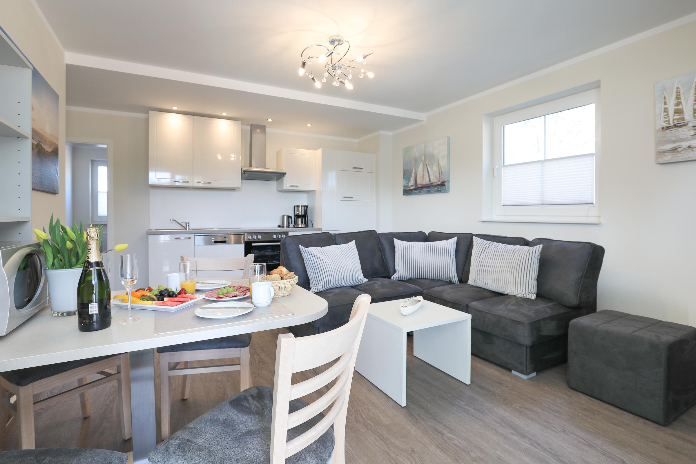 Das bequeme Sofa lädt zum gemütlichen Beisammensein oder zum Entspannen beim Fernsehen ein. Zur gut ausgestatteten Wohnküche gehört auch ein schöner Essbereich für Zwei.