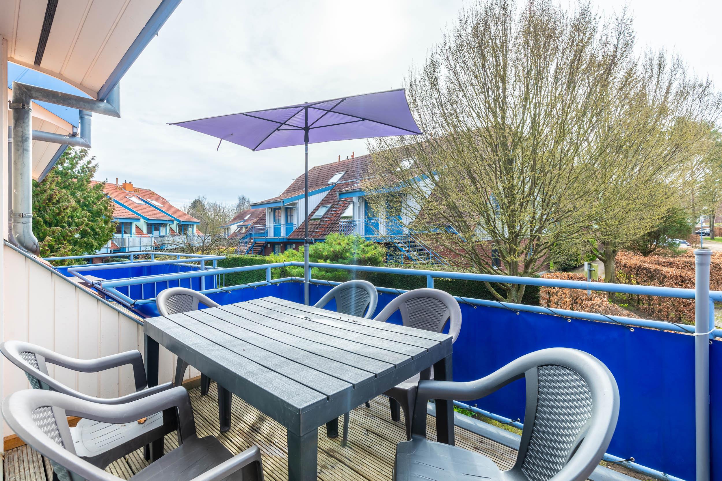 Im Wohnbereich in der ersten Wohnebene laden bequeme Möbel und Flatscreen-TV (Smart-TV mit Netflix, Prime und Disney+) zu entspannenden Stunden ein. Der direkte Zugang zum Südwest-Balkon mit Gartenmöbeln bietet herrliches Ostseefeeling.