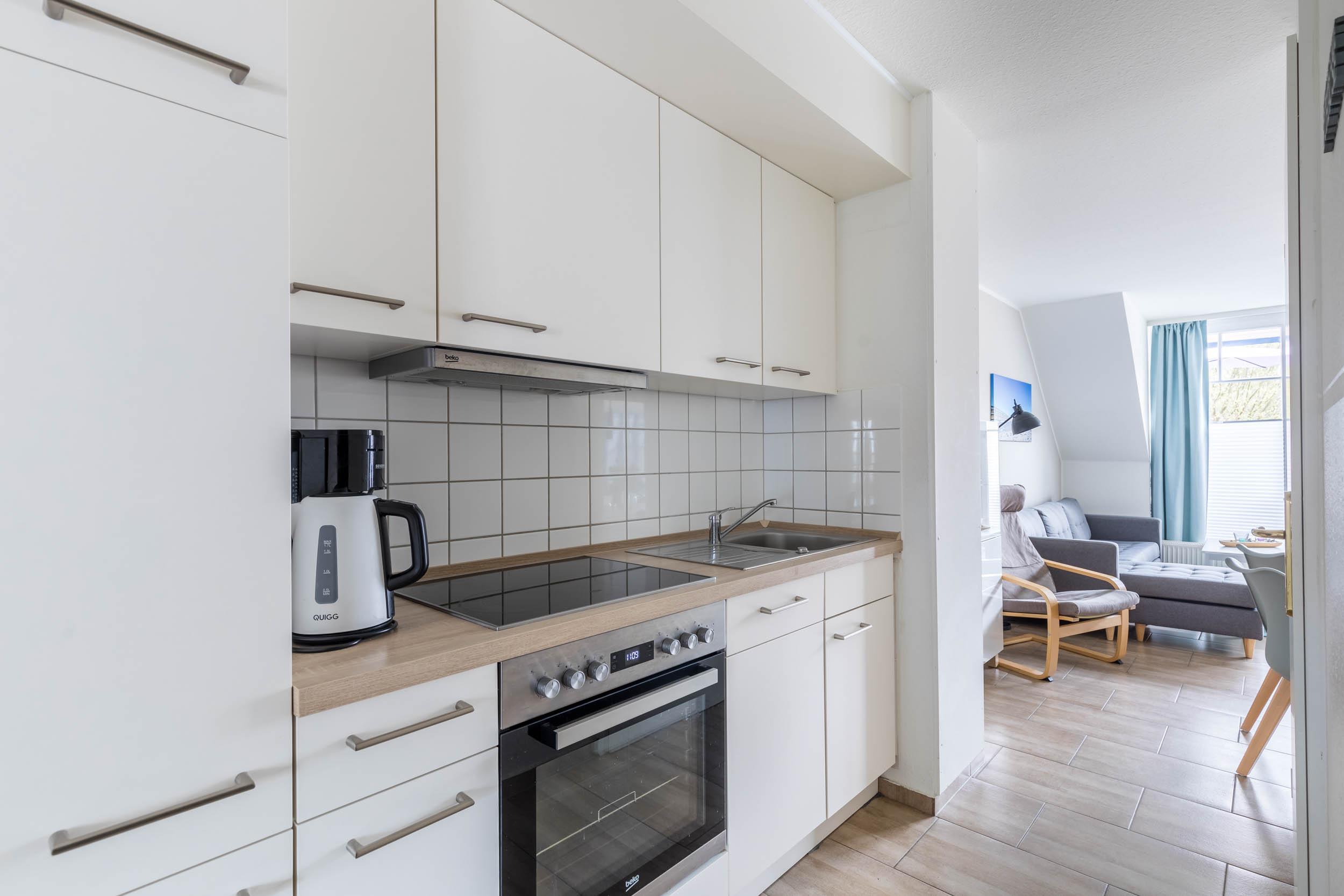 Die offene Küche mit angrenzender Essecke enthält eine Vielzahl von Elektrogeräten, die das Zubereiten der Mahlzeiten erleichtern. Passendes Geschirr, Besteck und Töpfe sind selbstverständlich ausreichend vorhanden.
