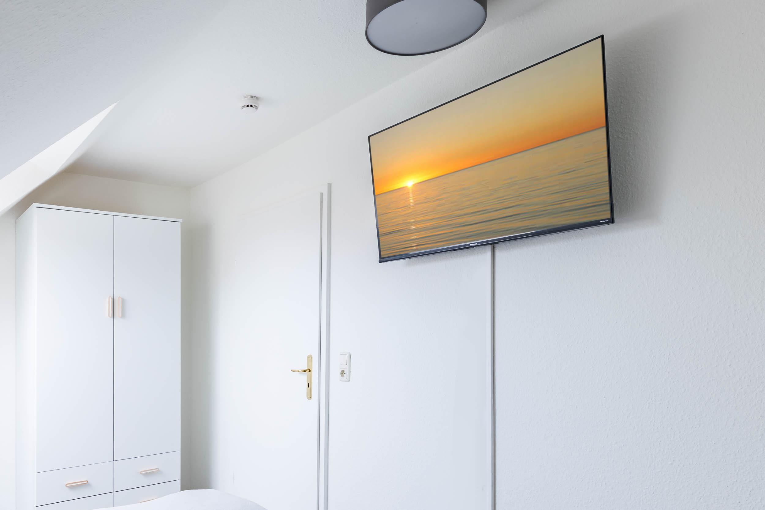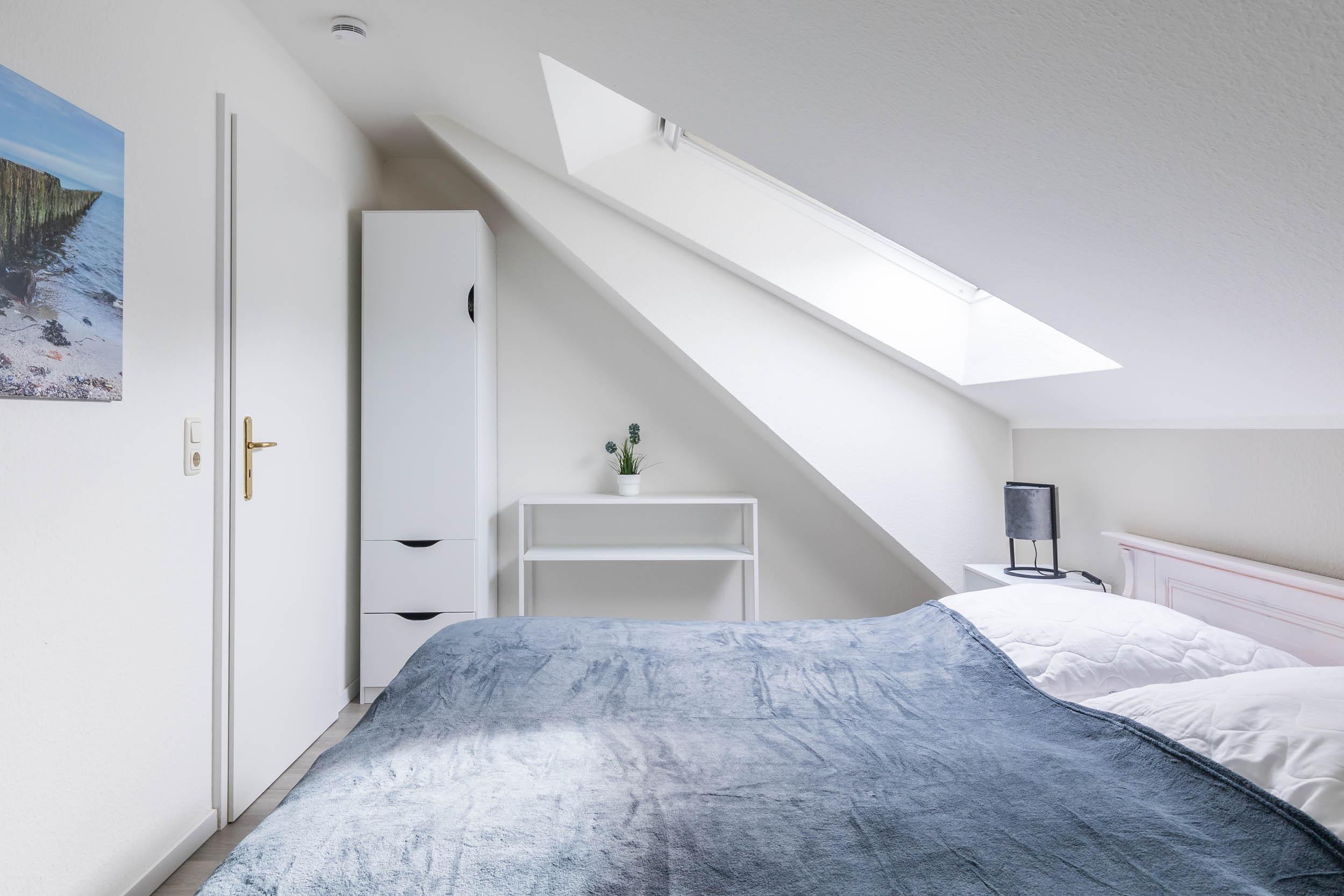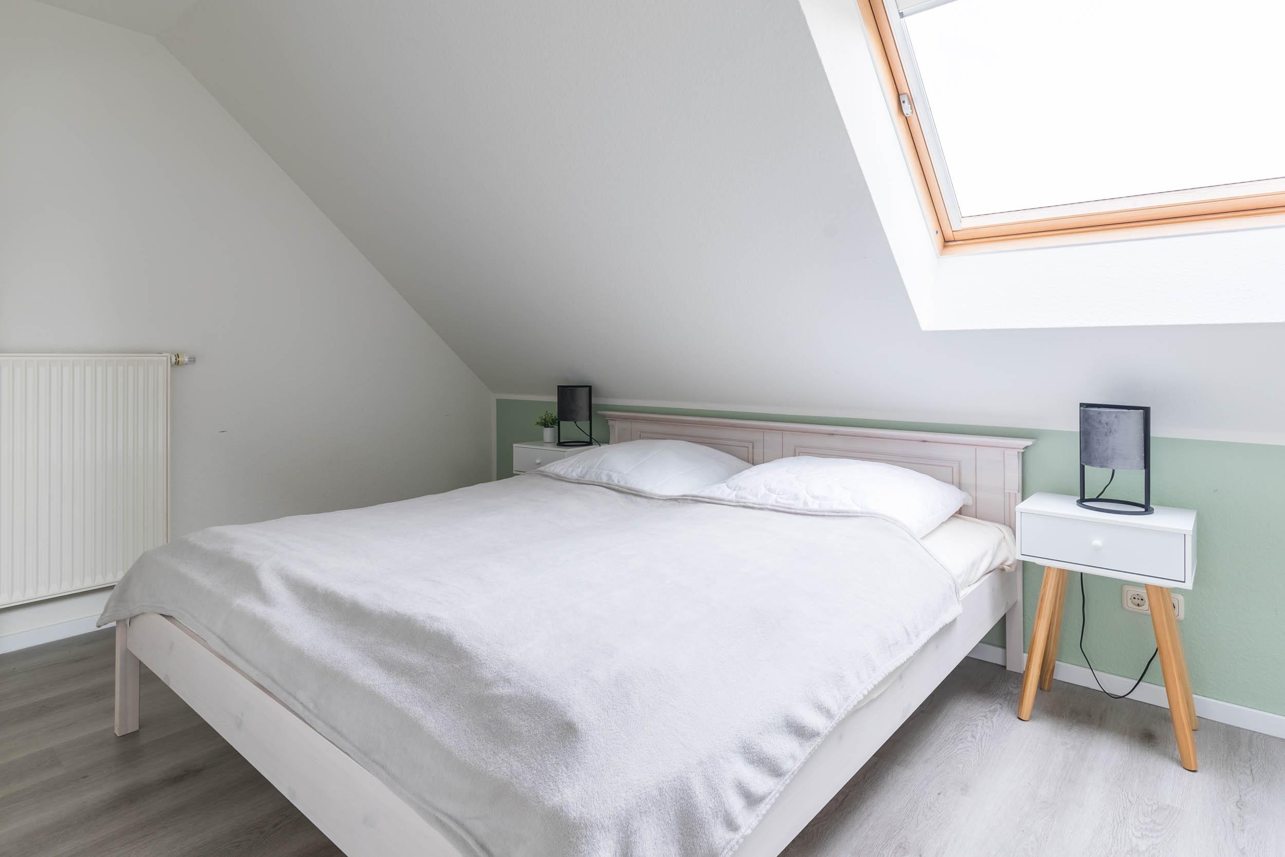 Vom Wohn- Esszimmer führt eine Treppe in die 2. Wohnebene, ins DG. Hier befinden sich zwei weitere Schlafräume, die jeweils mit einem Doppelbett ausgestattet sind. Zudem finden Sie in einem Schlafzimmer einen 2türigen Kleiderschrank und einen 2. SAT-TV. In dem anderen Schlafzimmer finden Sie einen 1türigen Kleiderschrank für Ihre Urlaubsgarderobe.
