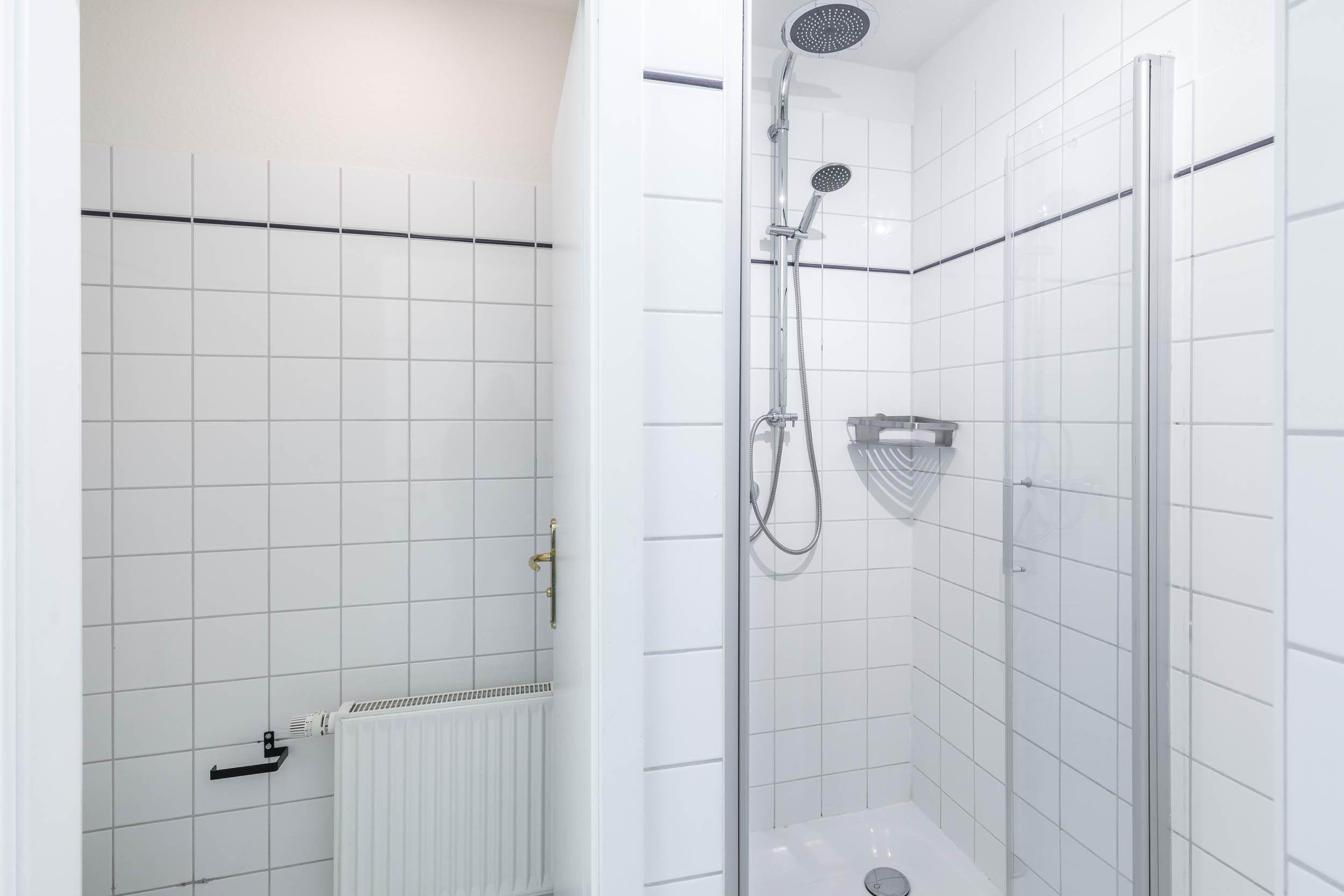 Das moderne und große Duschbad bietet zwei Waschtische und eine herrliche Regendusche. Das WC ist im Badezimmer separat unterteilt und mit Fenster ausgestattet.