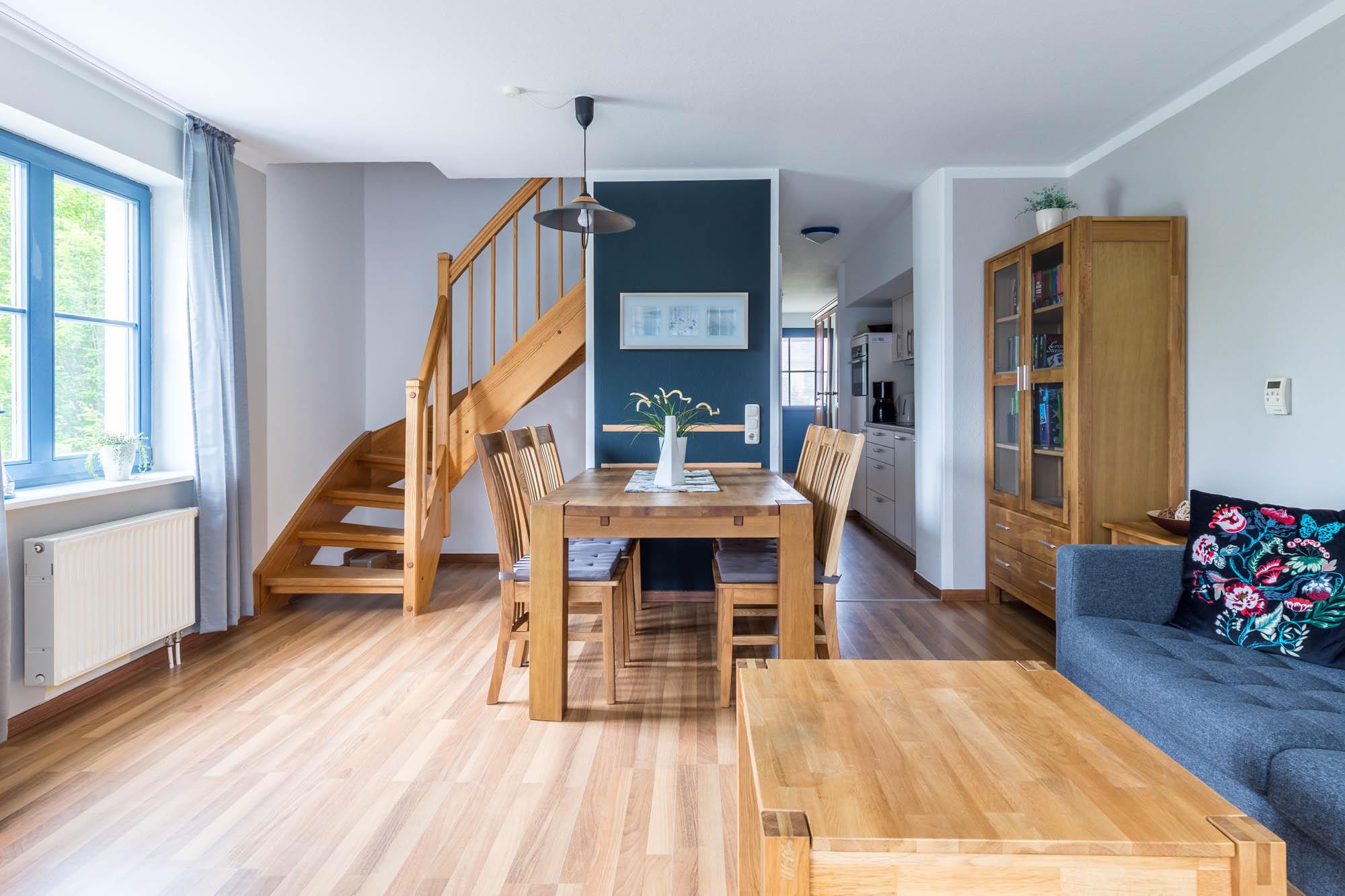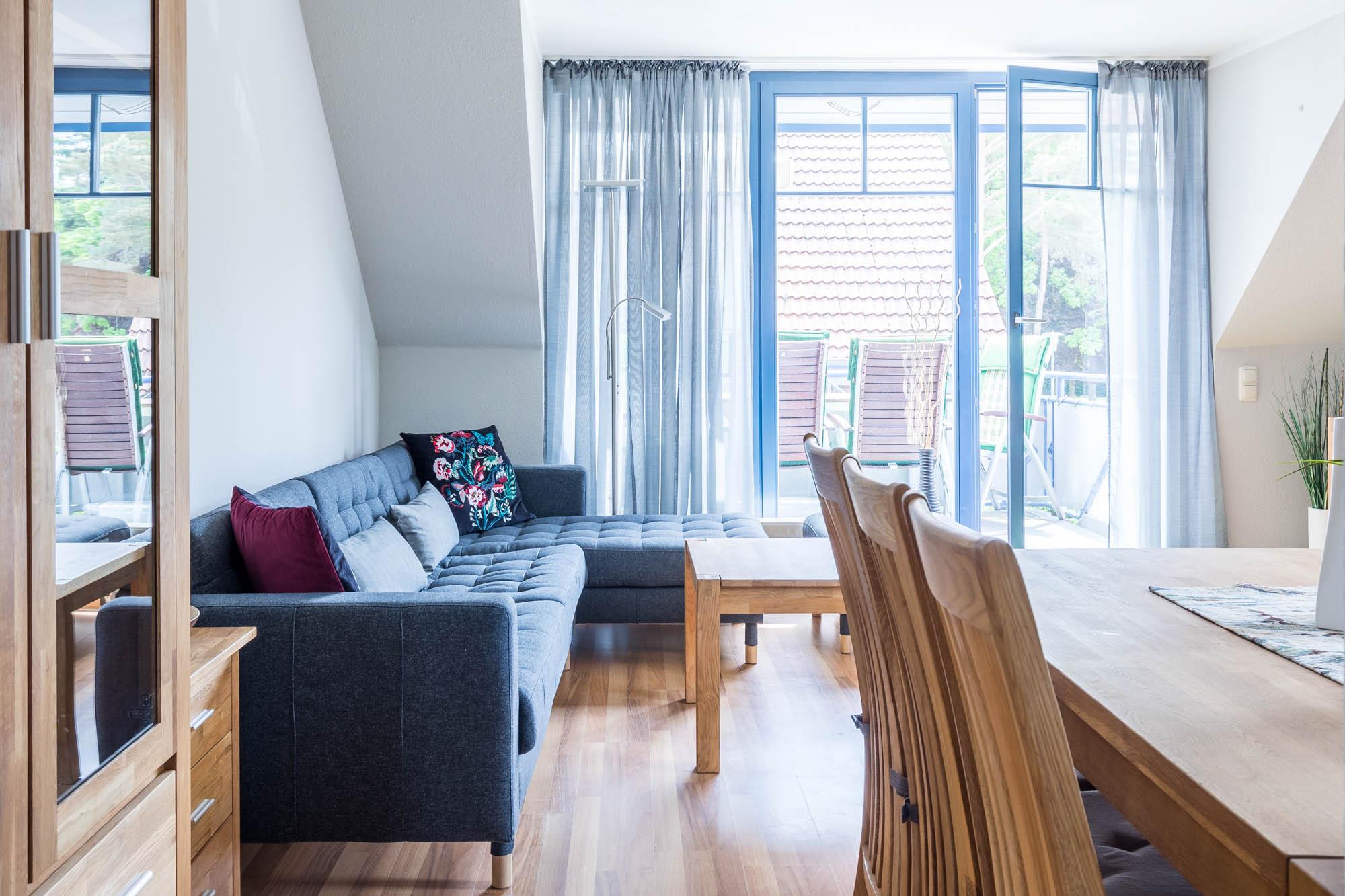 Im Wohnbereich in der ersten Wohnebene laden bequeme Möbel und Flatscreen-TV zu entspannenden Stunden ein. Der direkte Zugang zum Balkon mit Gartenmöbeln bietet herrliches Ostseefeeling.