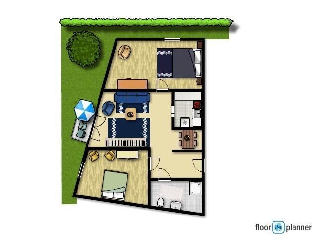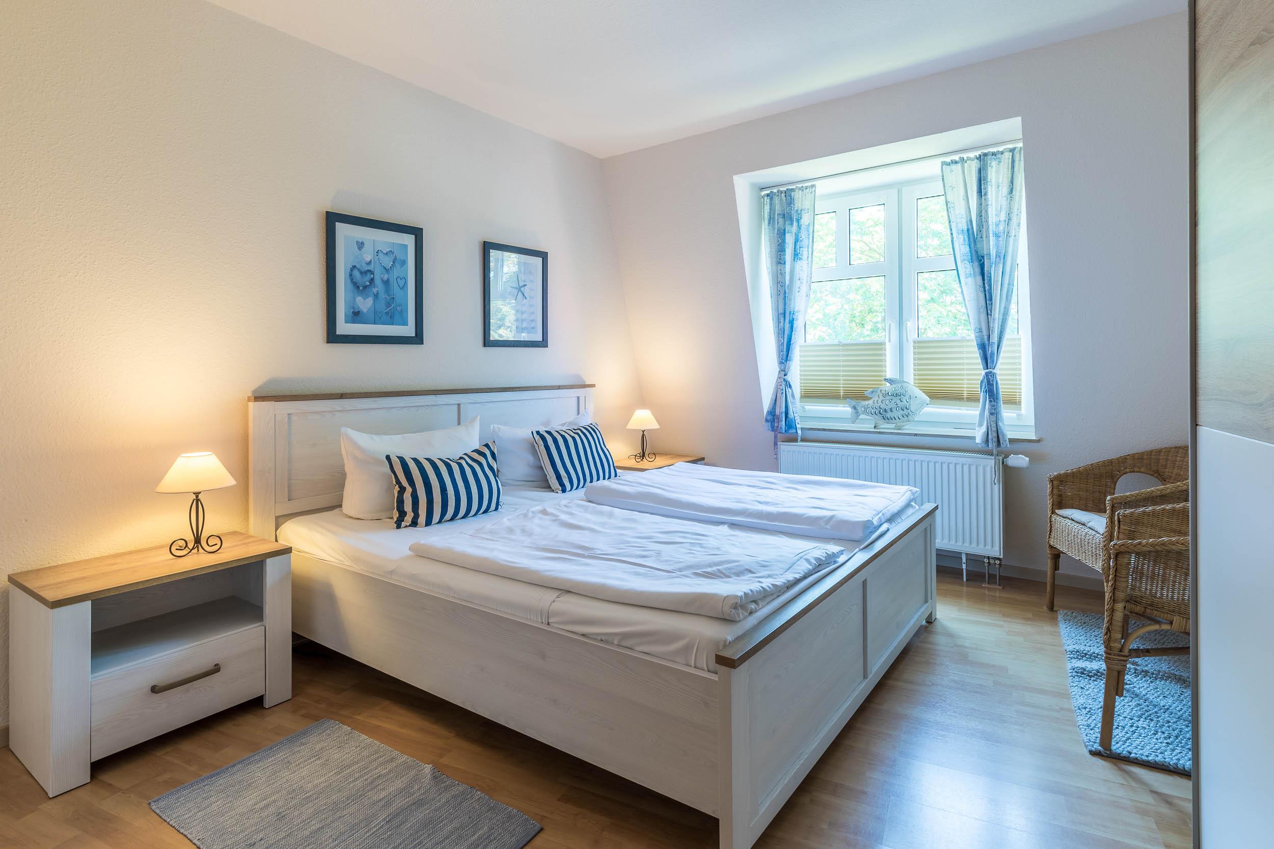 Im Schlafzimmer stehen ein bequemes Doppelbett (180x200cm), eine kleine Sitzecke sowie ein Kleiderschrank bereit. Hier ist außerdem genügend Platz, um bei Bedarf ein Reisebettchen aufzustellen. Das Gästezimmer ist ebenfalls mit einem Doppelbett (180x200cm) und einem großem Kleiderschrank möbliert.