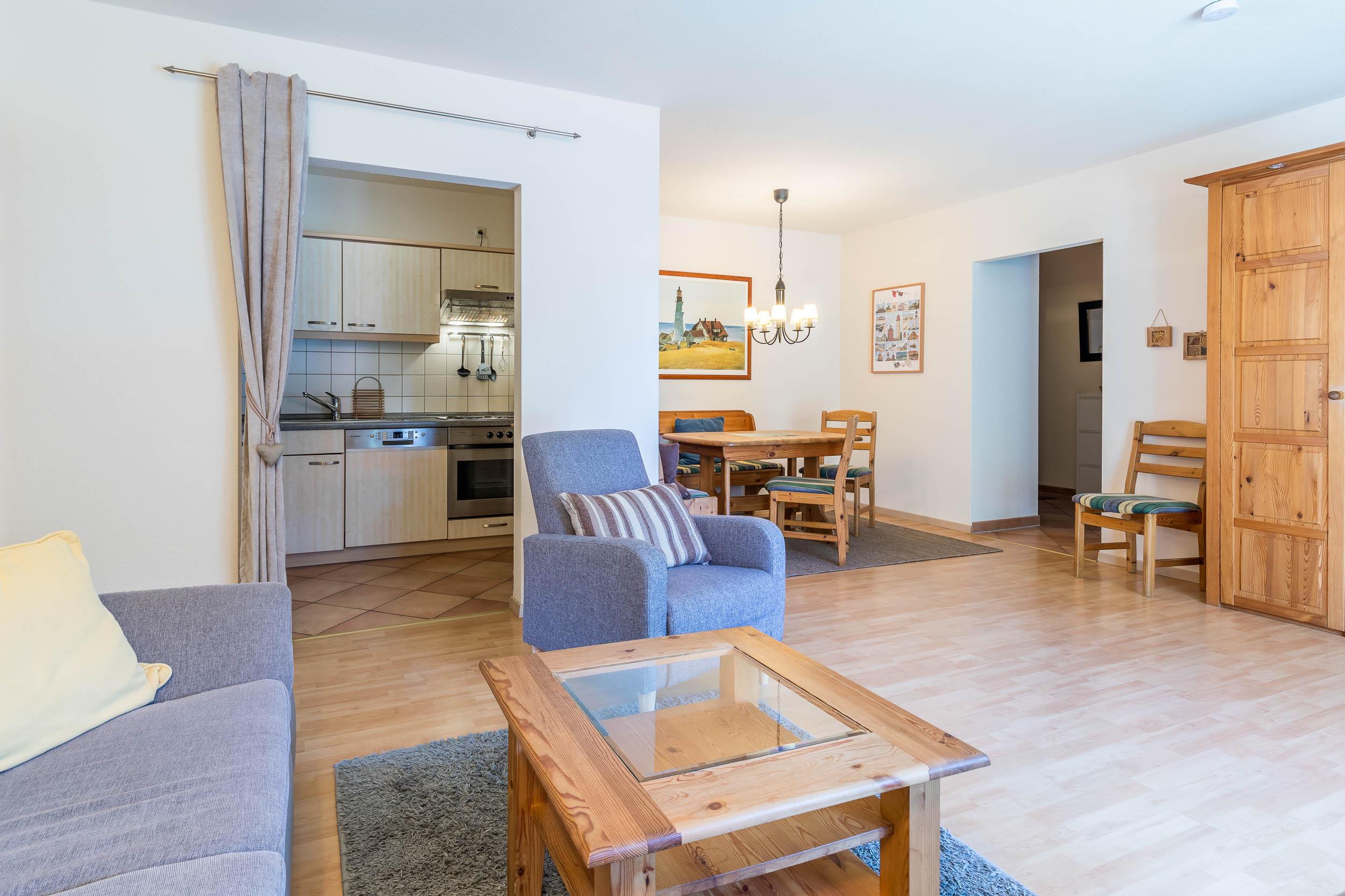 Die hochwertig bestückte offene Küche, die Essecke und die Polstergarnitur bilden die drei Zentren des großzügigen Wohnbereichs. Flatscreen-TV, Musikanlage und DVD-Player sorgen hier bei Bedarf für Ihre Unterhaltung. Ein Reisebettchen könnte bei Bedarf auch im Wohnbereich aufgestellt werden. An der gemütlichen Essecke können alle gemeinsam ihre Mahlzeiten einnehmen.