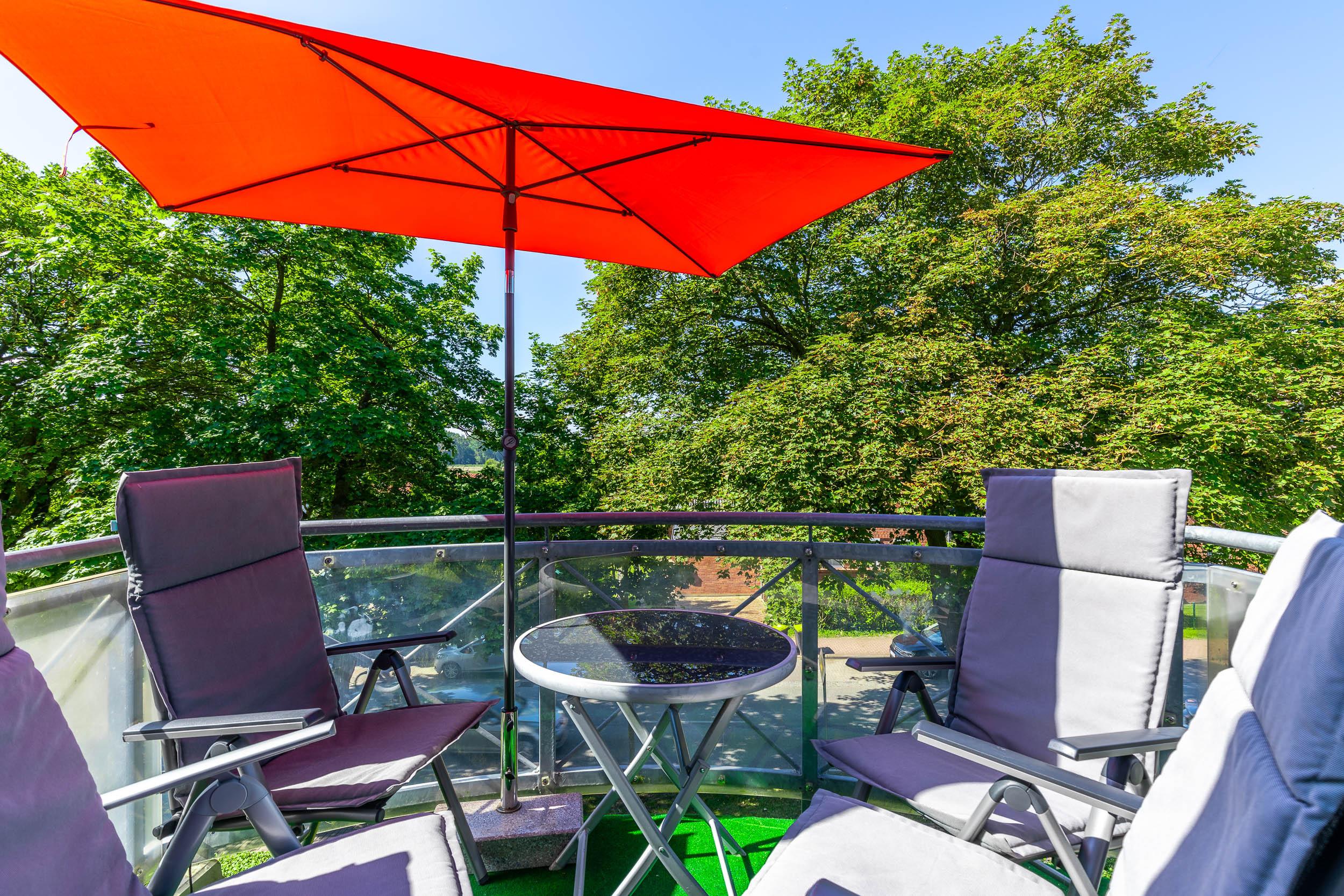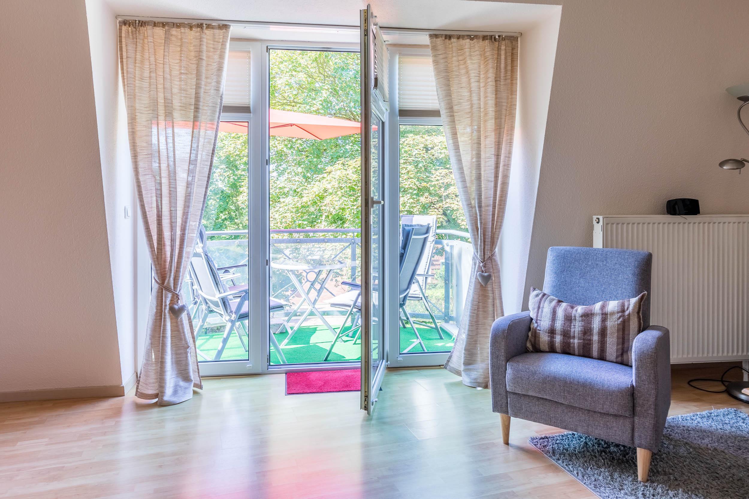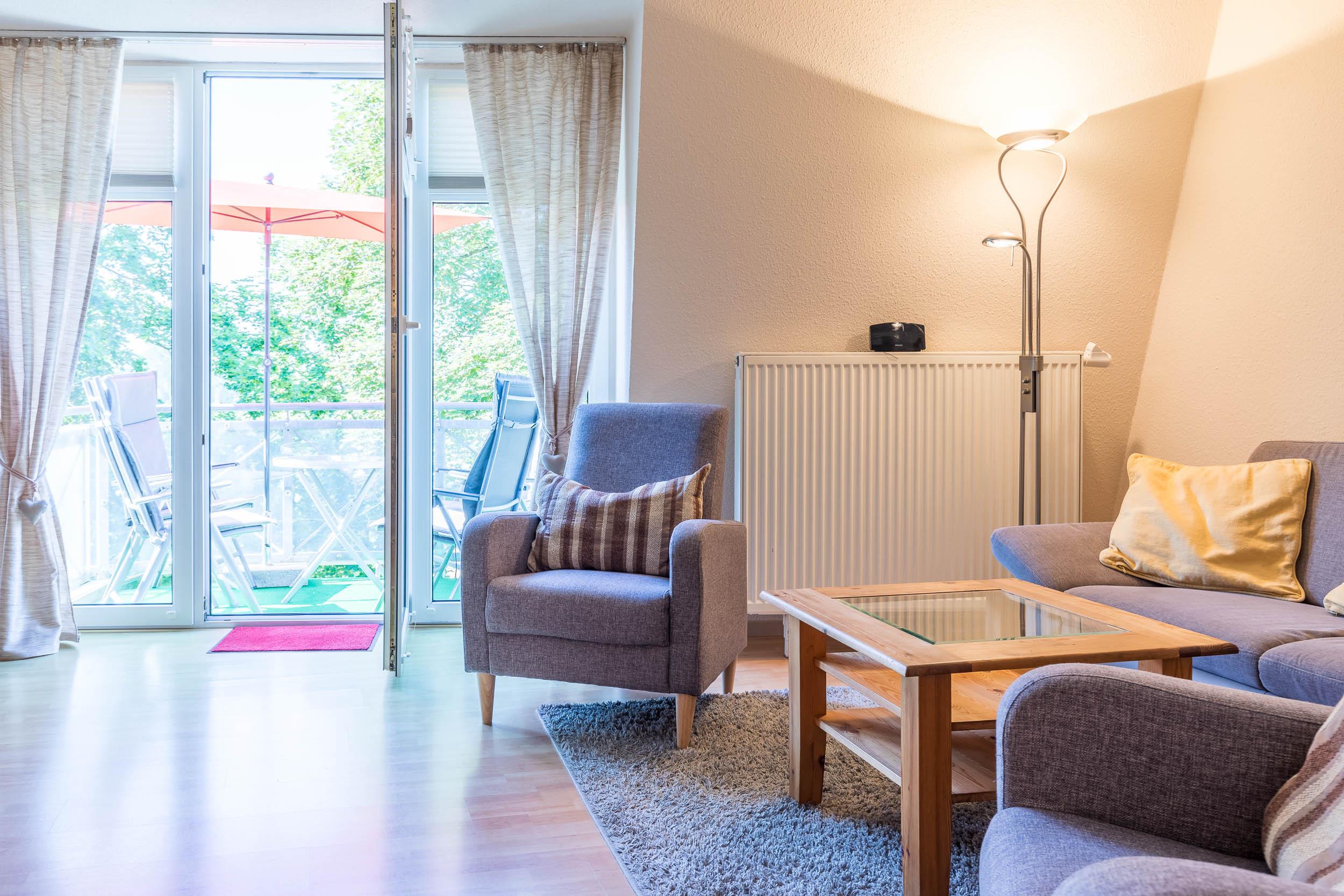 Der möblierten Südbalkon, welchen Sie direkt vom Wohnzimmer aus erreichen, lässt Sie, liebe Gäste, auch am Abend die gute Stimmung anhalten und das bunte Treiben im Ort beobachten.