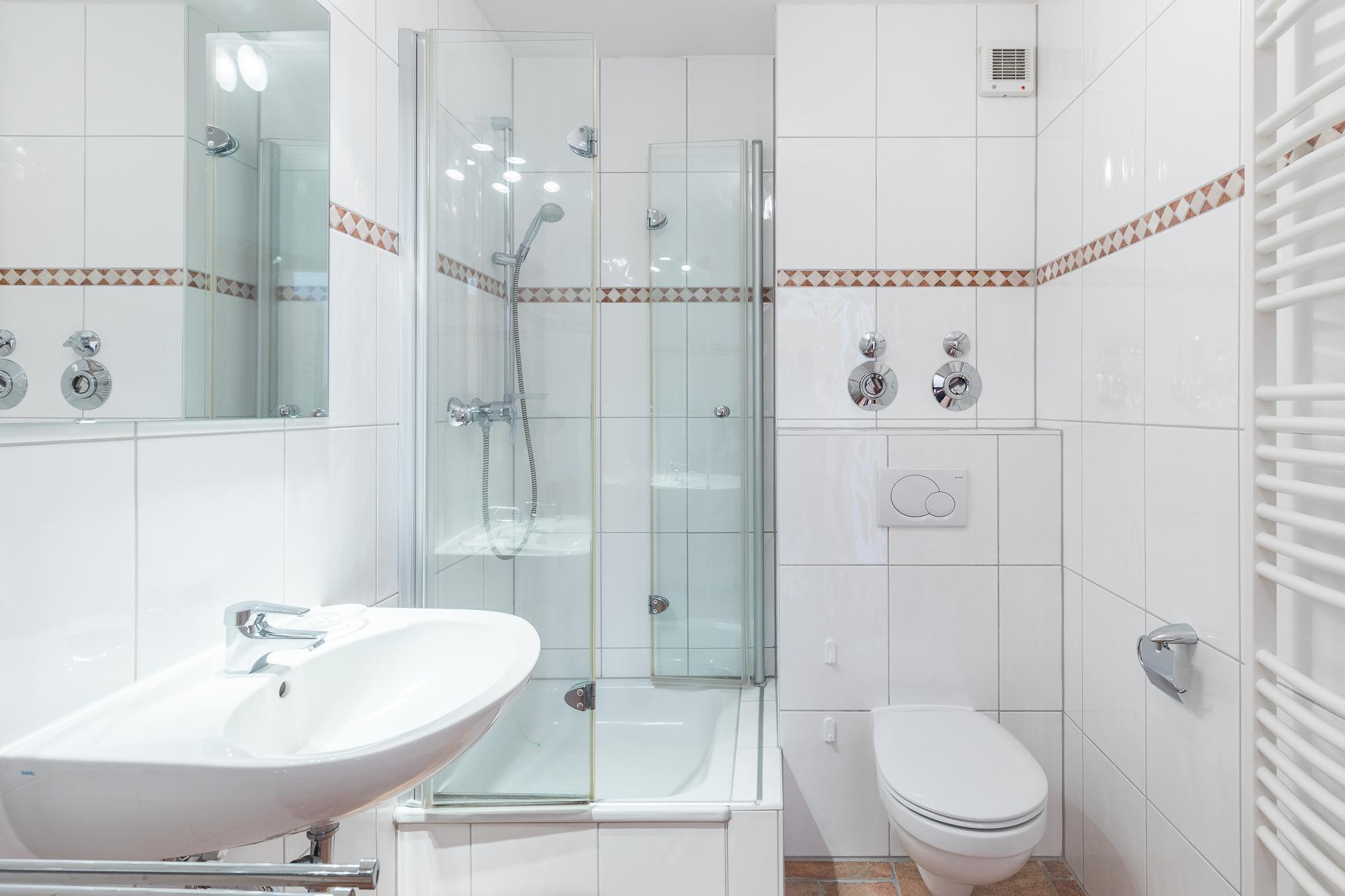Das innenliegende Badezimmer ist mit Fußbodenheizung sowie Dusche und WC eingerichtet.