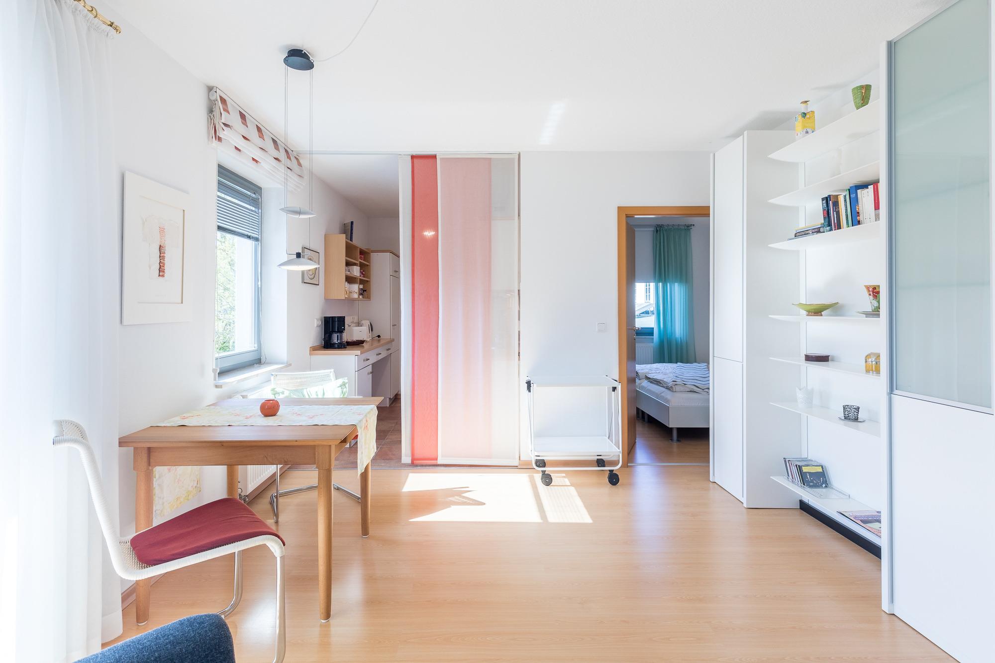 Die hell und freundlich eingerichtete 2-Zimmer-Ferienwohnung befindet sich im 1.OG und bietet Ihnen auf etwa 45qm Wohnfläche eine Ausstattung für 2 Gäste.