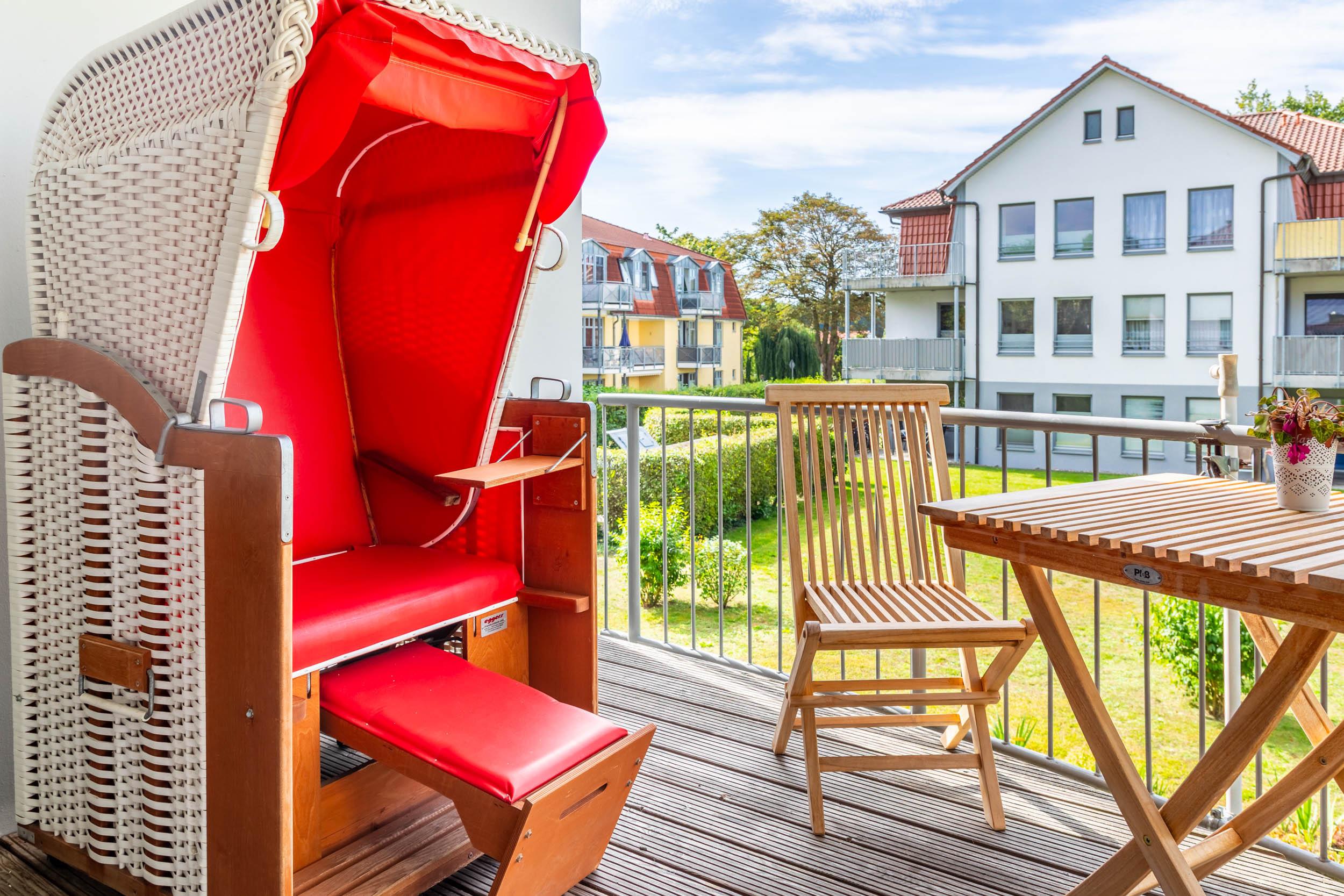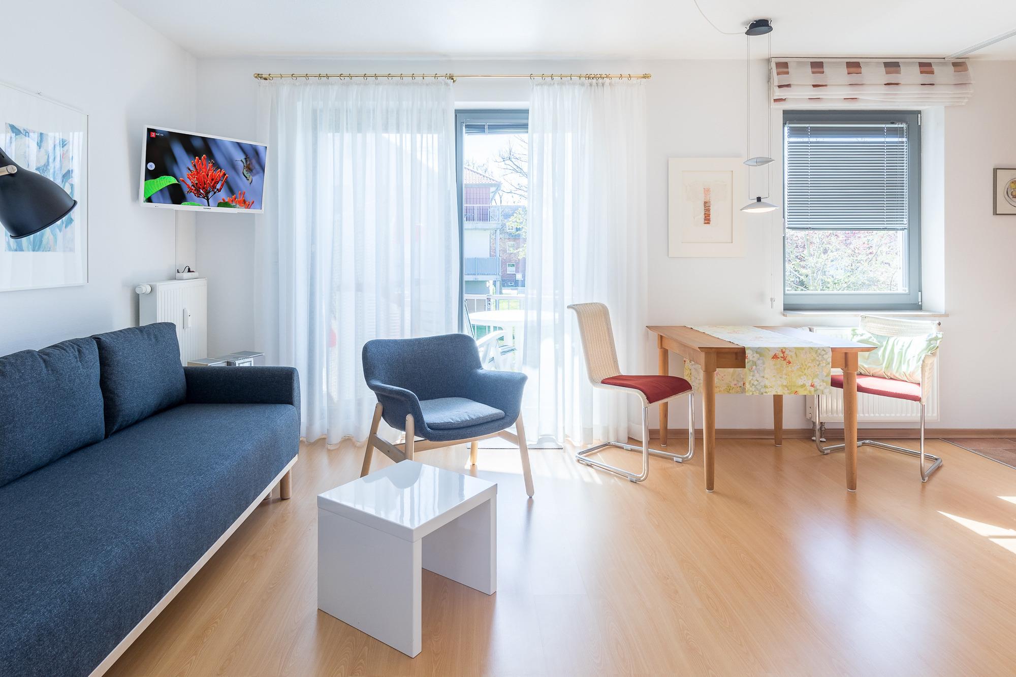Im Wohnbereich befindet sich eine Couch mit Sessel. Der Flatscreen-TV ist an der Wand angebracht. Von hier aus gelangen Sie auch auf den möblierten Südwest-Balkon. Sogar ein Strandkorb steht hier für Sie bereit.