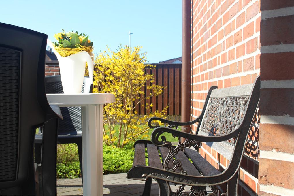 Durch eine Glastür gelangen Sie direkt auf die möblierte Südwest-Terrasse mit angrenzendem eingezäunten Grundstück. Hier darf auch gegrillt werden (Grill bitte selbst mitbringen).