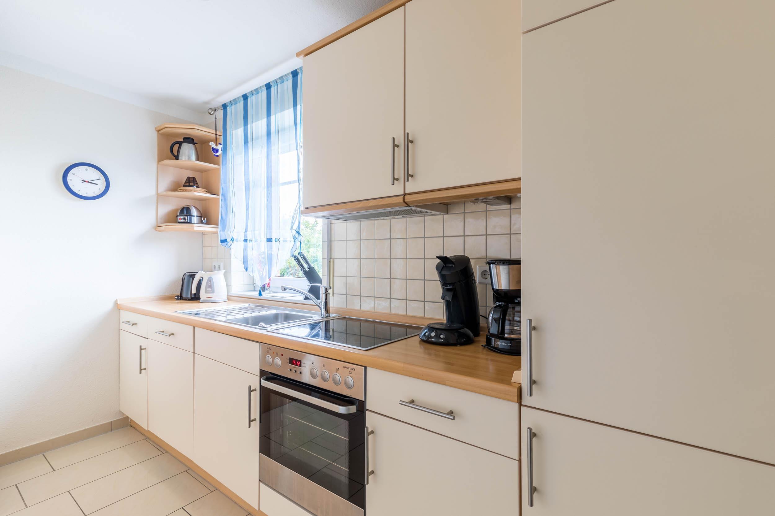 Die separate Küche ist modern mit Kühlschrank mit Gefrierfach, Herd/ Ceranfeld, Backofen, Geschirrspüler, Mikrowelle, Elektrokleingeräte sowie ausreichend Geschirr [&] Co. ausgestattet.
