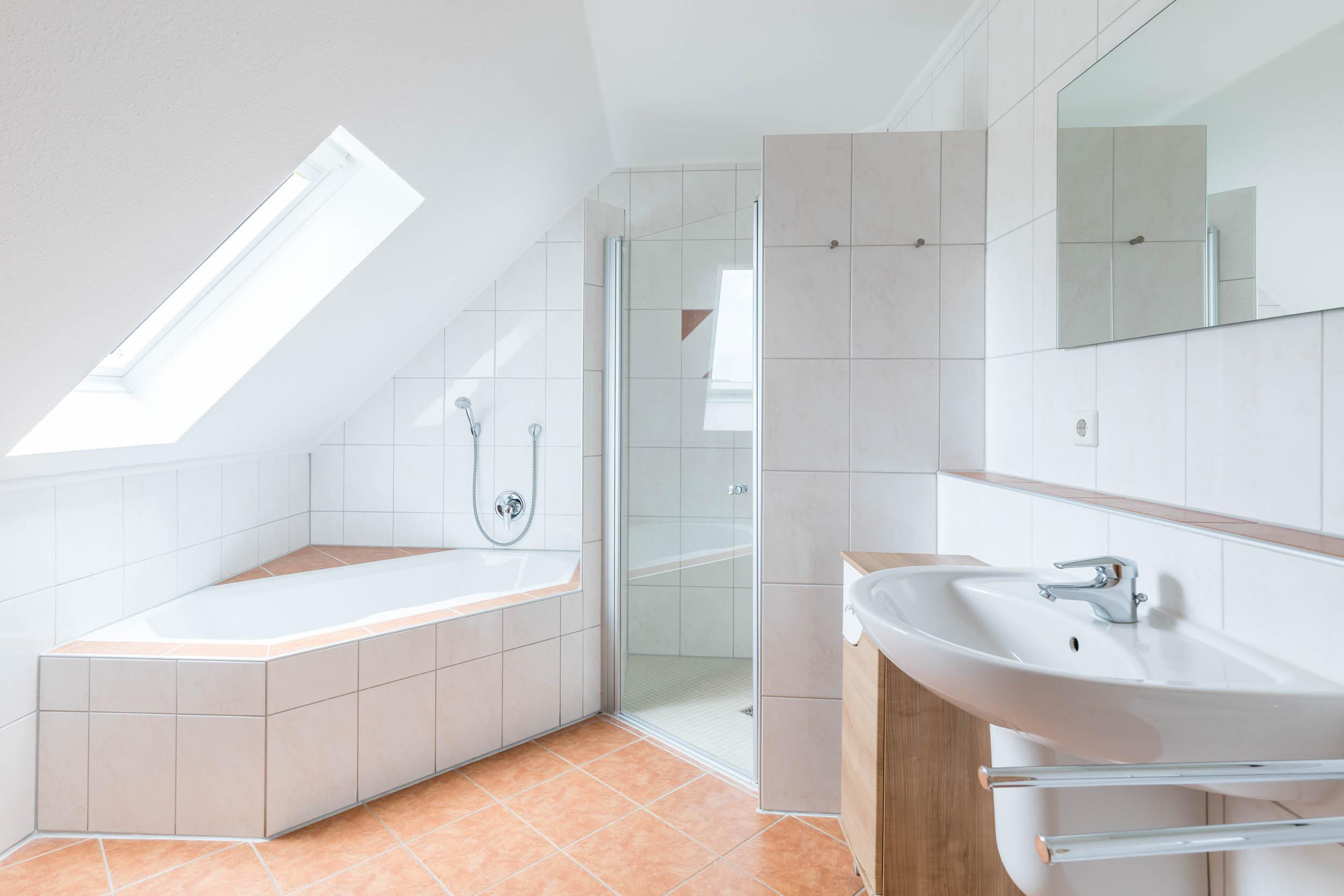 Ein großes Bad mit barrierefreier Dusche, Eckbadewanne und Waschtisch, getrennt vom separaten WC-Raum, ermöglichen hier zu jeder Zeit auch bei voller Belegung einen stressfreien Ablauf.