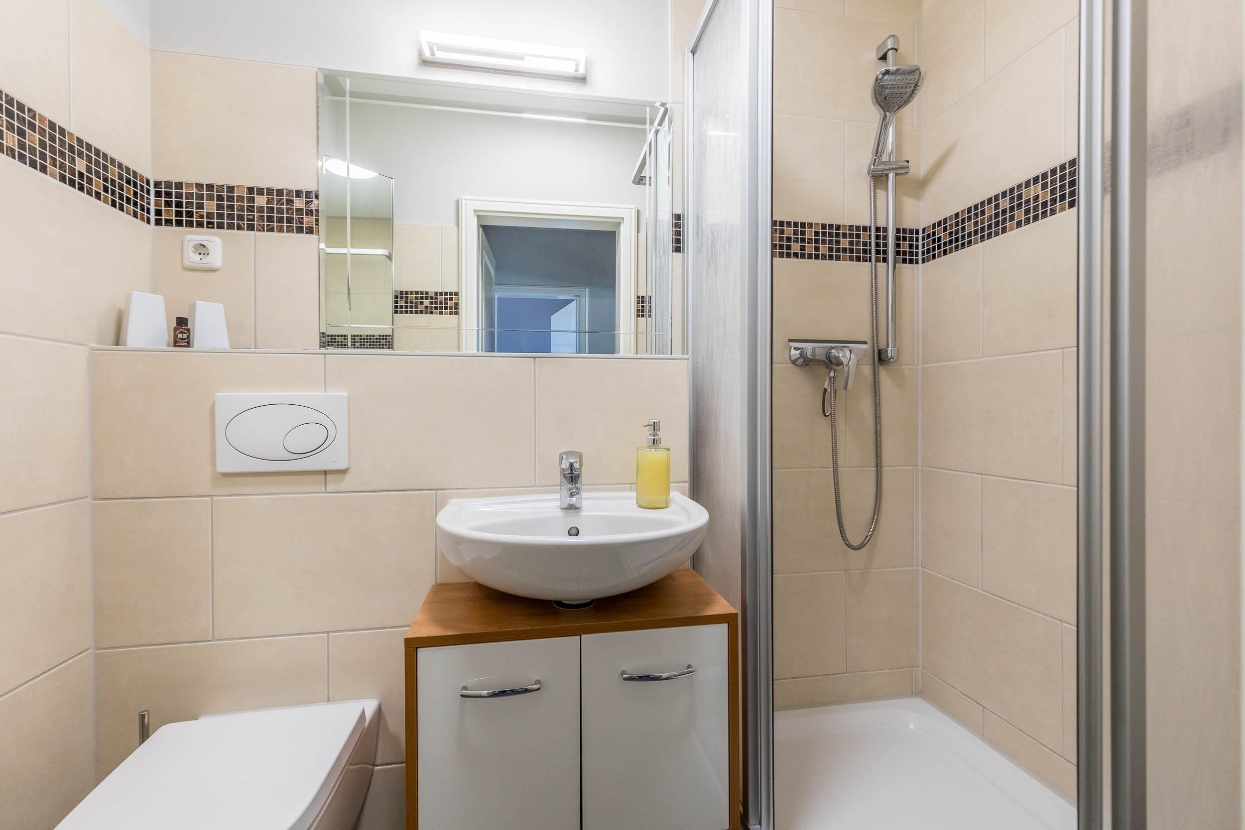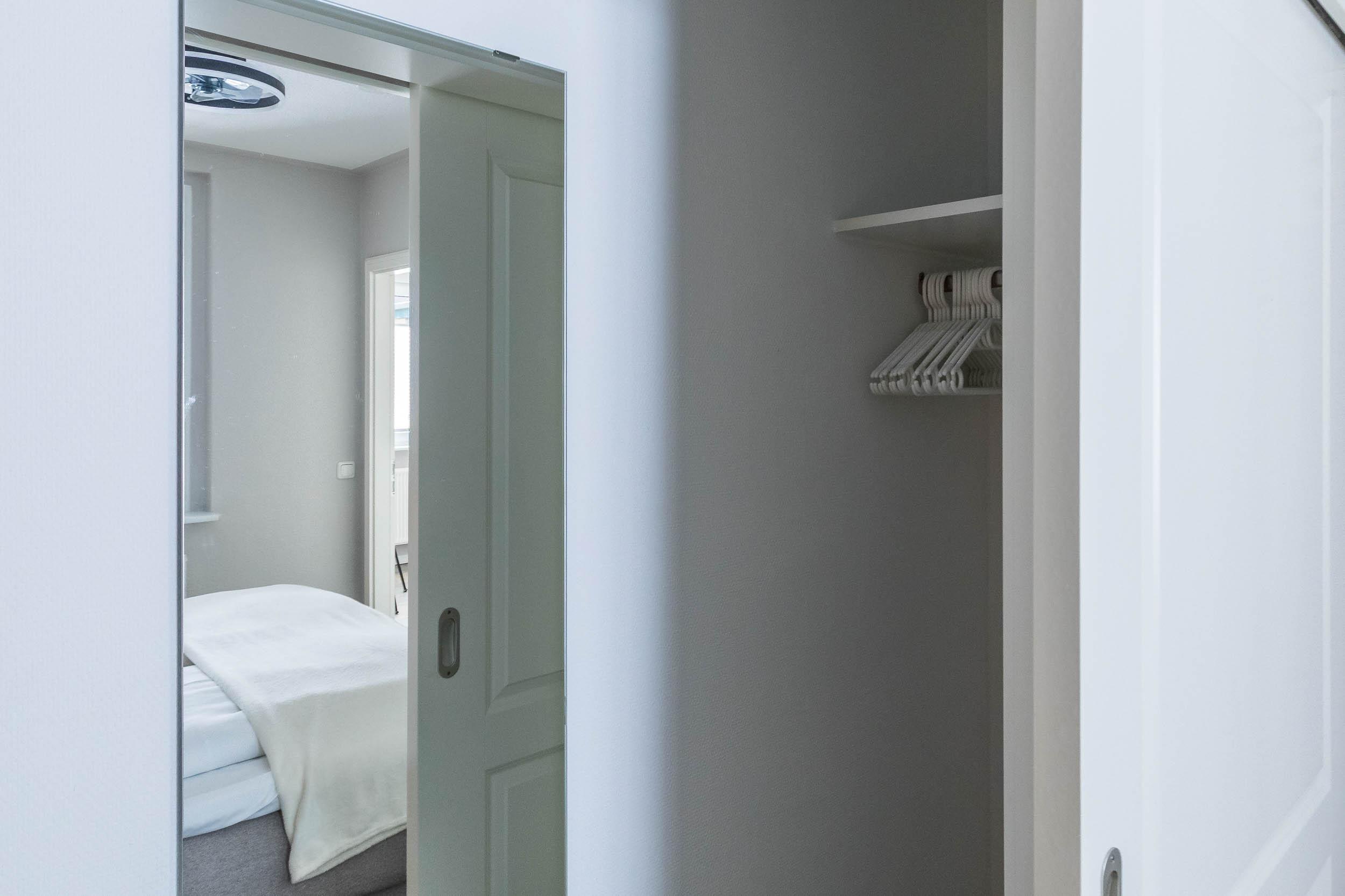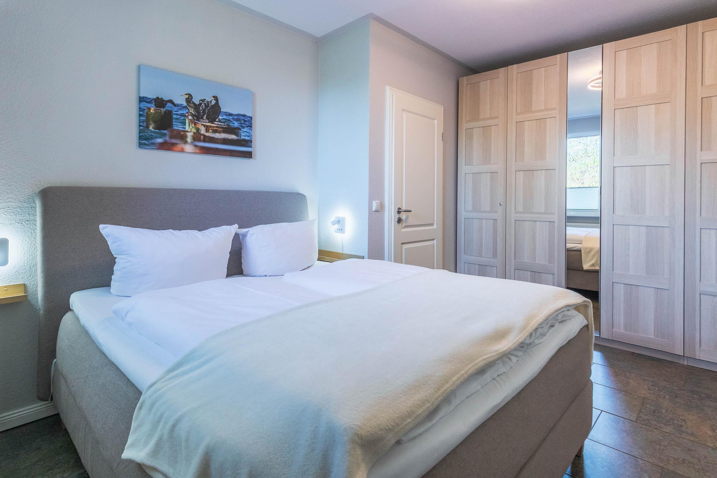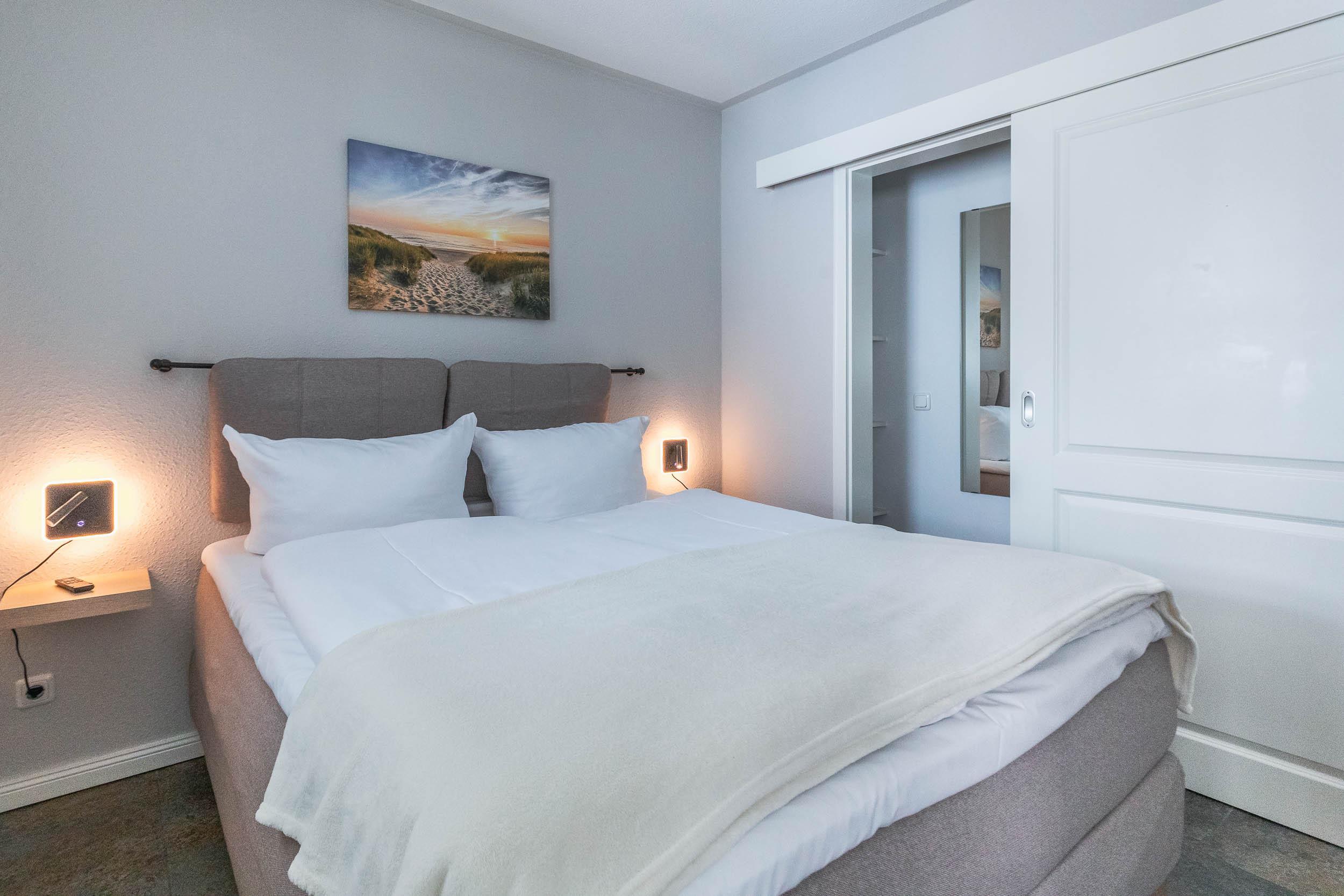 Zwei separate Schlafzimmer stehen zur Verfügung, jeweils mit Boxspringbett (160x200?cm). In einem Schlafzimmer befindet sich ein großer Kleiderschrank, im anderen ein kleinerer begehbarer Schrank. Das Badezimmer ist mit Dusche und WC ausgestattet.