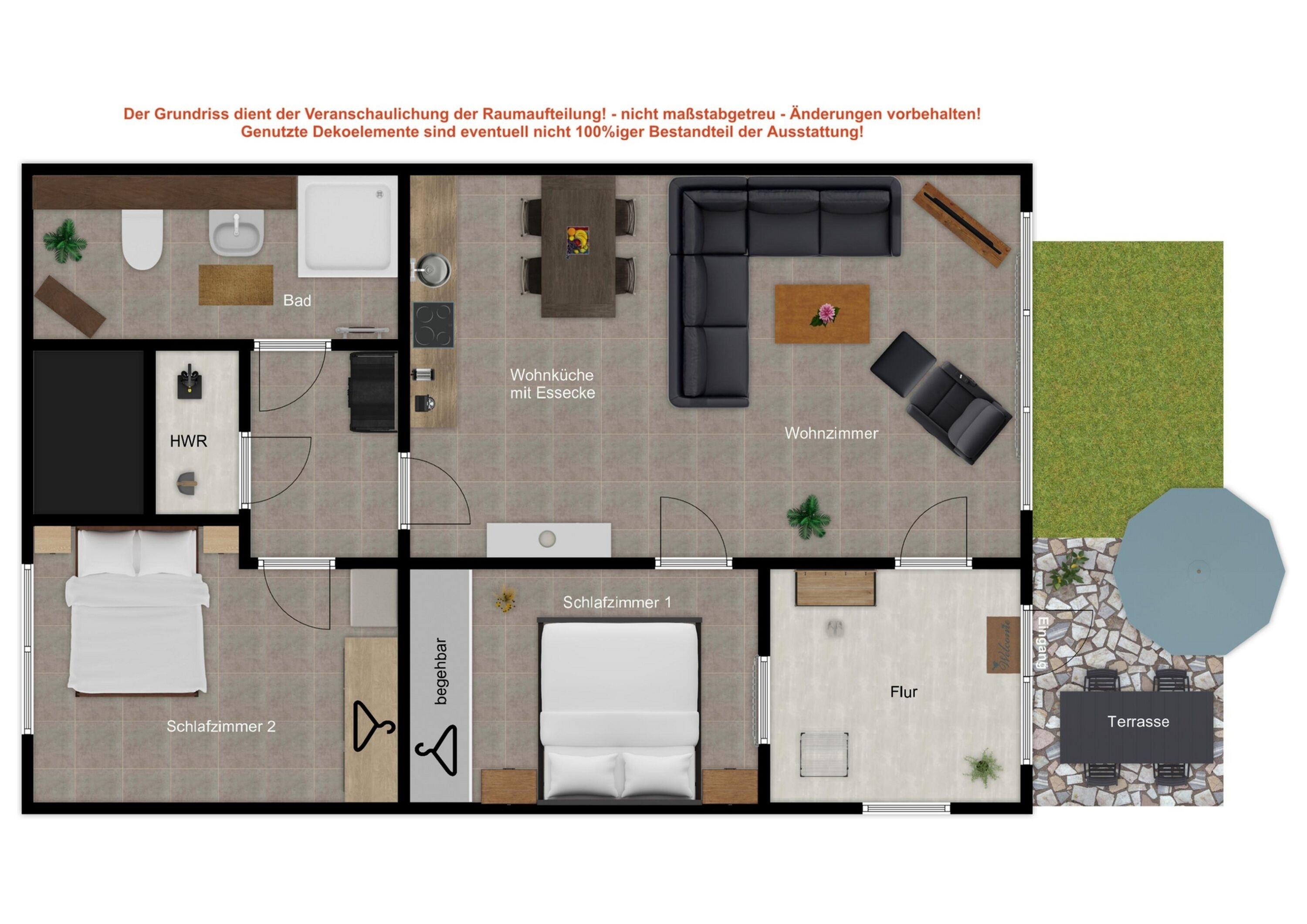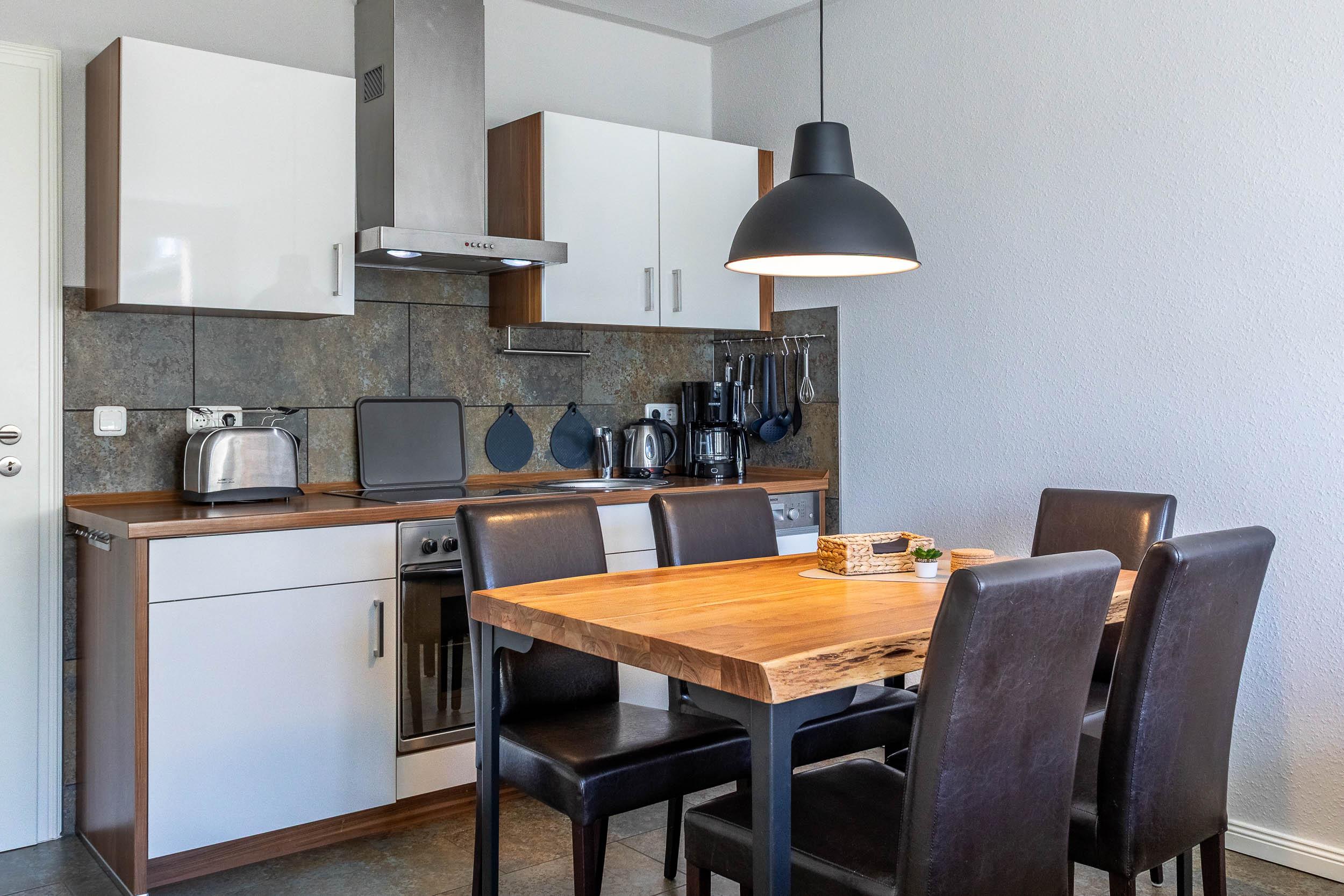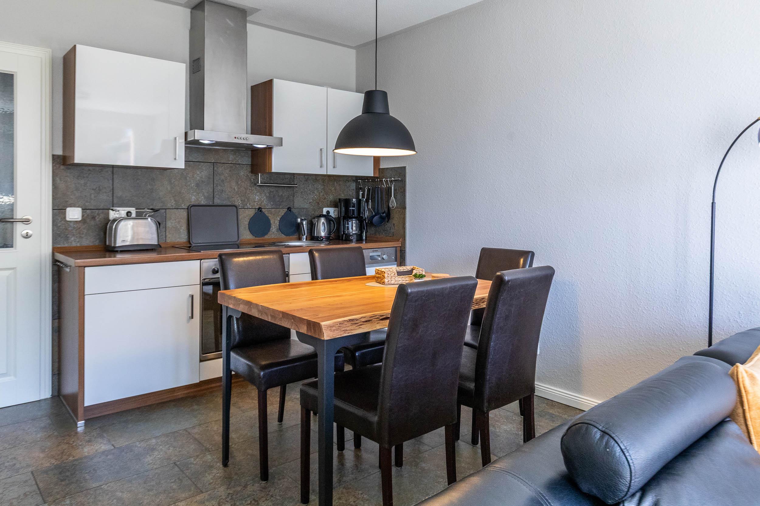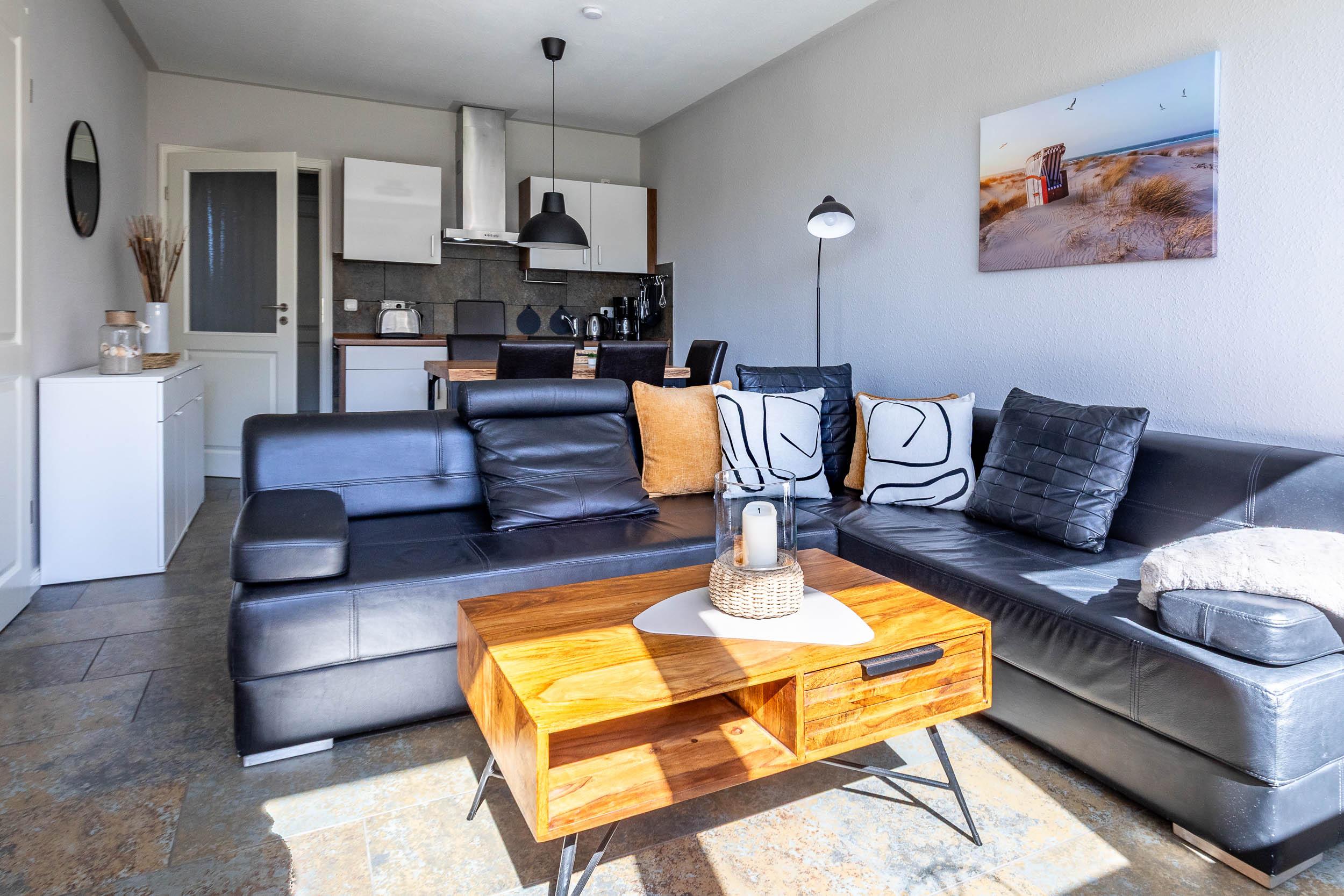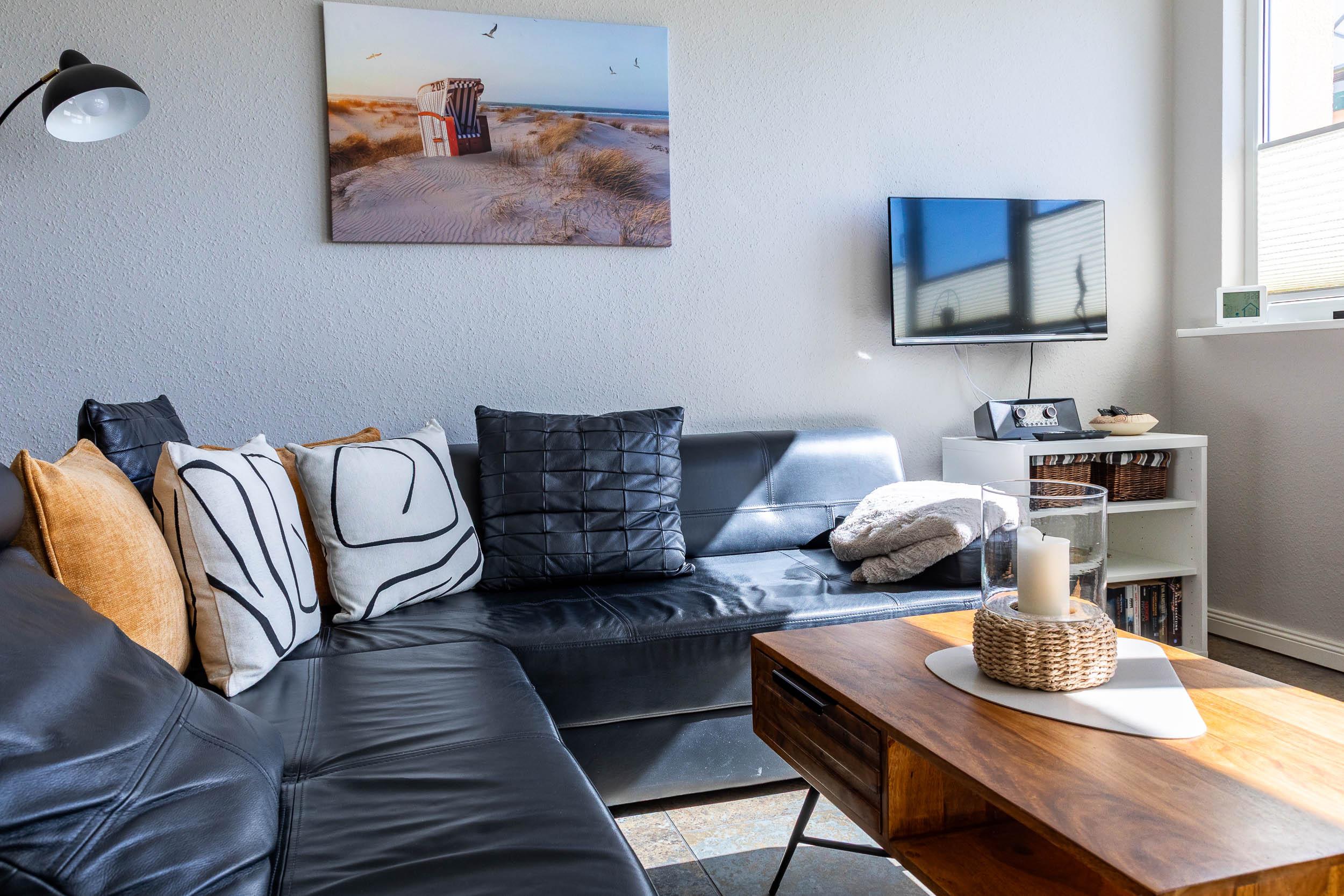 Die 3-Zimmer-Ferienwohnung im Erdgeschoss bietet auf rund 52?m² Wohnfläche eine moderne Ausstattung für bis zu 4 Gäste. Der Wohn- und Essbereich ist wohnlich eingerichtet und verfügt über eine bequeme Sofaecke, TV und Musikanlage.