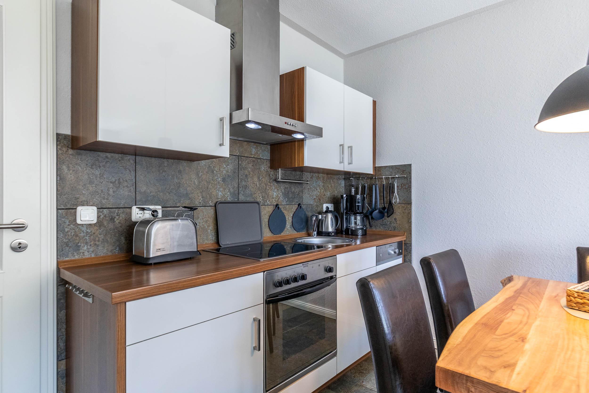 Die offene Küche ist mit Herd/Backofen, Kühlschrank mit Gefrierfach, Spülmaschine sowie Geschirr, Gläsern und Besteck komplett ausgestattet. Von der sonnigen, möblierten Süd-Terrasse gelangen Sie über einen separaten Eingang direkt in die Wohnung.