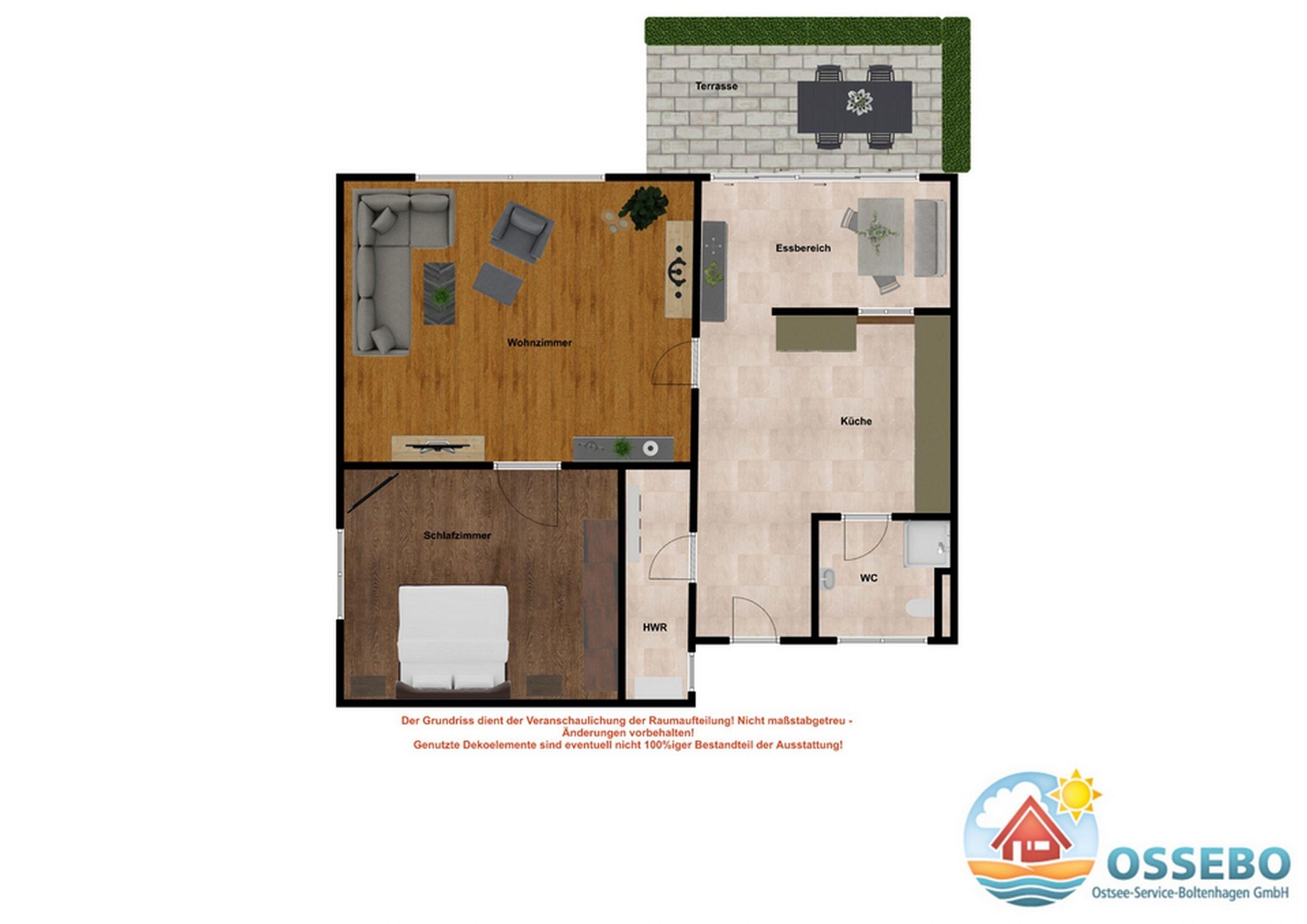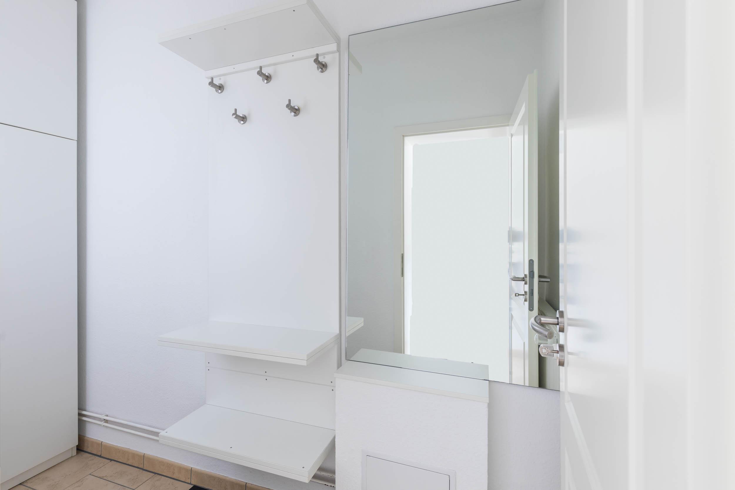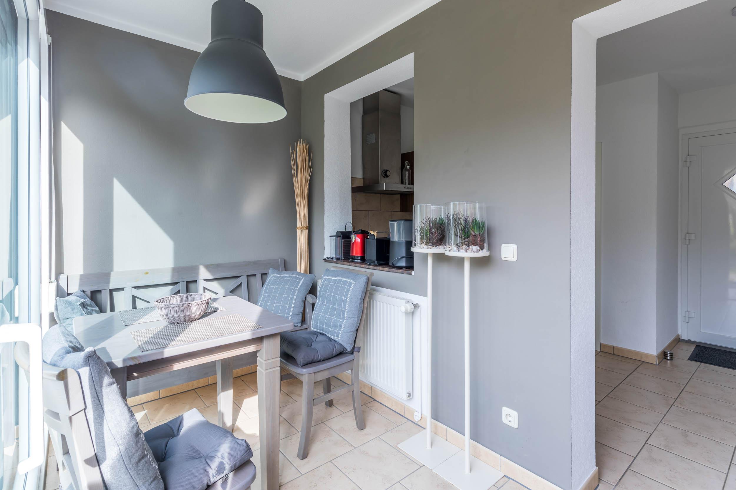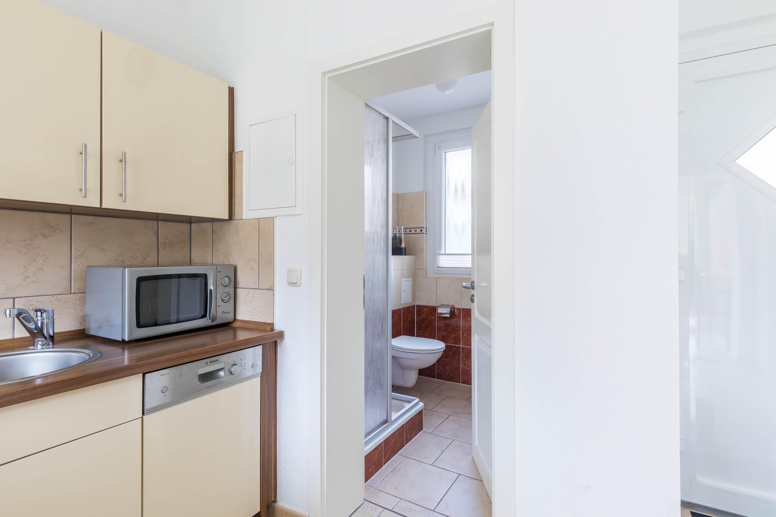 Die Ferienwohnung bietet für 2 Gäste Platz. Der Eingangsbereich ist überdacht. In einem separaten Raum befindet sich die Garderobe, ein großer Spiegel und ein Haushaltsschrank. Im Wohnbereich befindet sich eine komfortable Couch mit Schlaffunktion. Das Schlafzimmer ist mit einem 1,80 m x 2,00 m (2 Matratzen je 0,9 m x 2 m) Bett, einem Kleiderschrank sowie Sat-TV eingerichtet. Die Küche ist mit einem Kühlschrank mit Gefrierfach, Backofen, 4er Ceranfeld, Geschirrspüler, Wasserkocher, Toaster, Mikrowelle sowie Filterkaffeemaschine und Nespresso-Maschine (Zusatz) ausgestattet. Von der Küche aus betritt man den Wintergarten mit Essbereich und Zugang zur Sonnenterrasse.