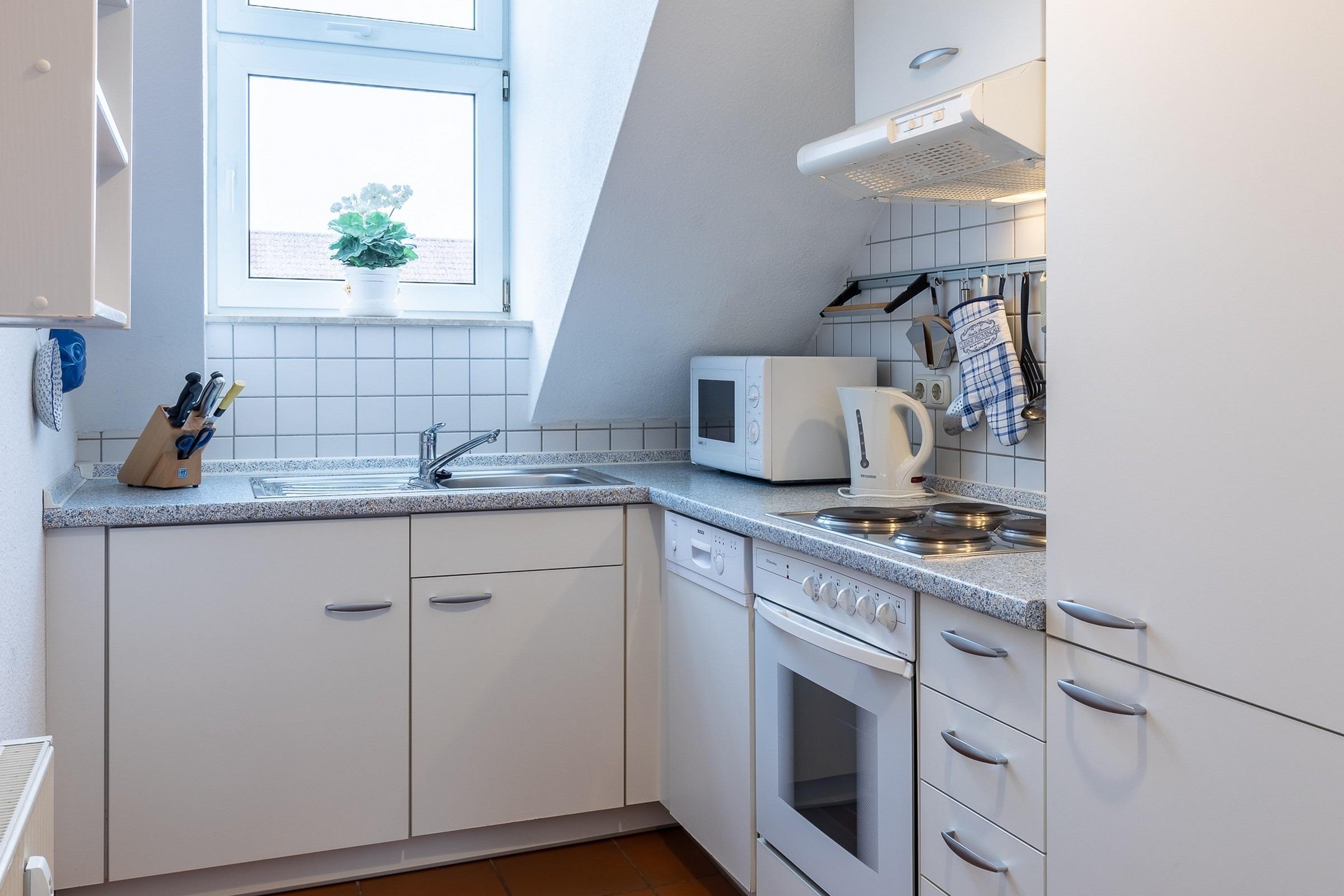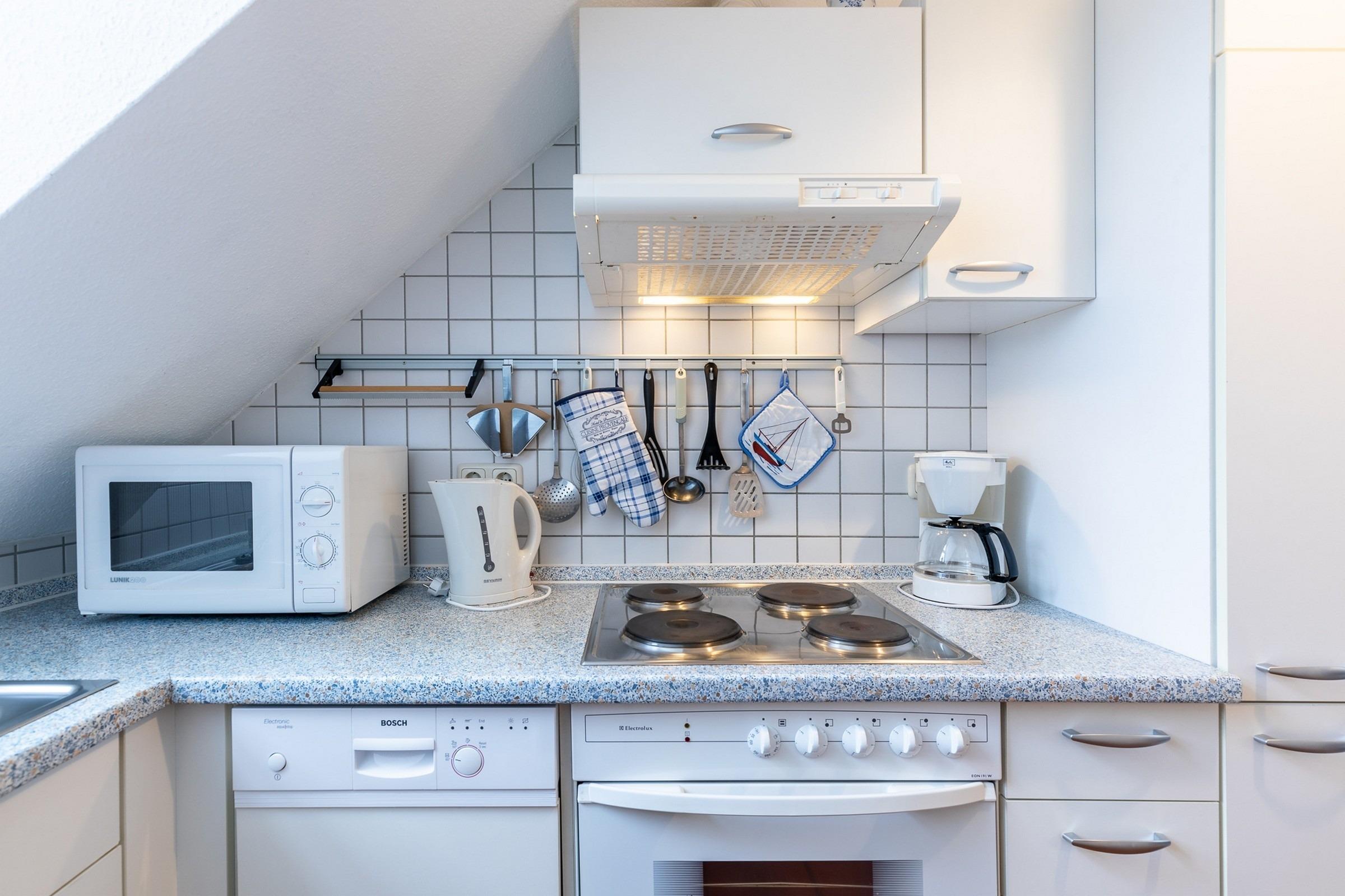Die Küche bietet eine Vollausstattung, so sind hier u.a. Herd, Backofen, Kühlschrank mit Gefrierfach, Geschirrspüler, Mikrowelle uvm.